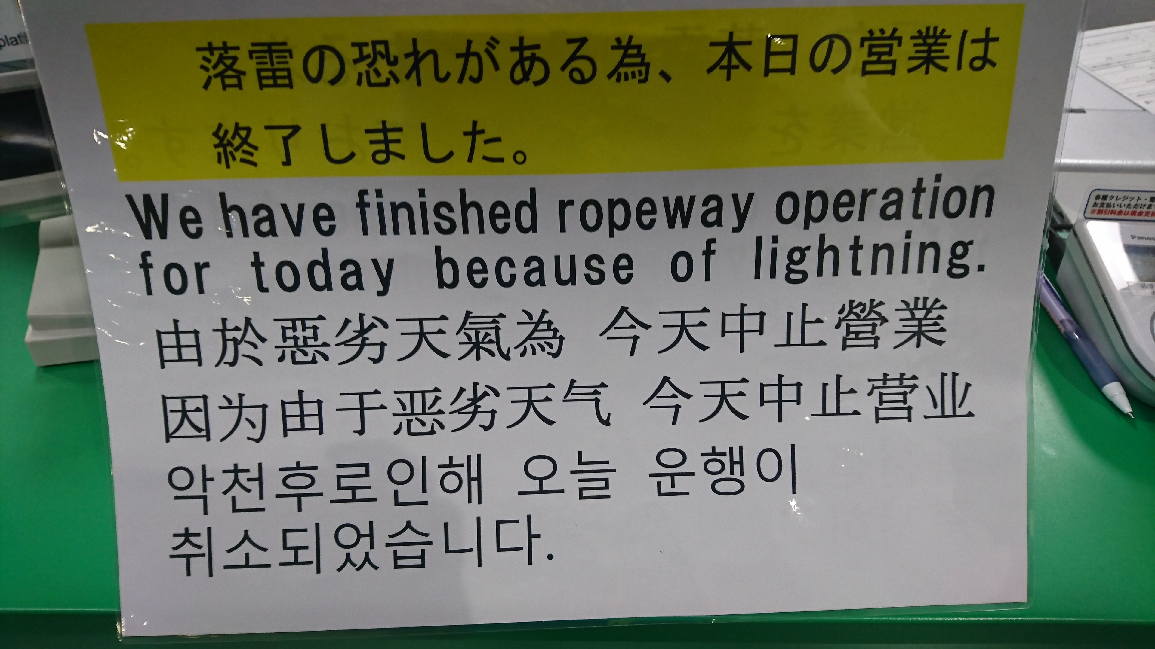 ここまで自転車で来ているし、雨も降ってないし、今さっきロープウェイ出てたよ!?受付嬢も今日は雷のため営業中止です、の貼り紙を作っているまさに最中だった。