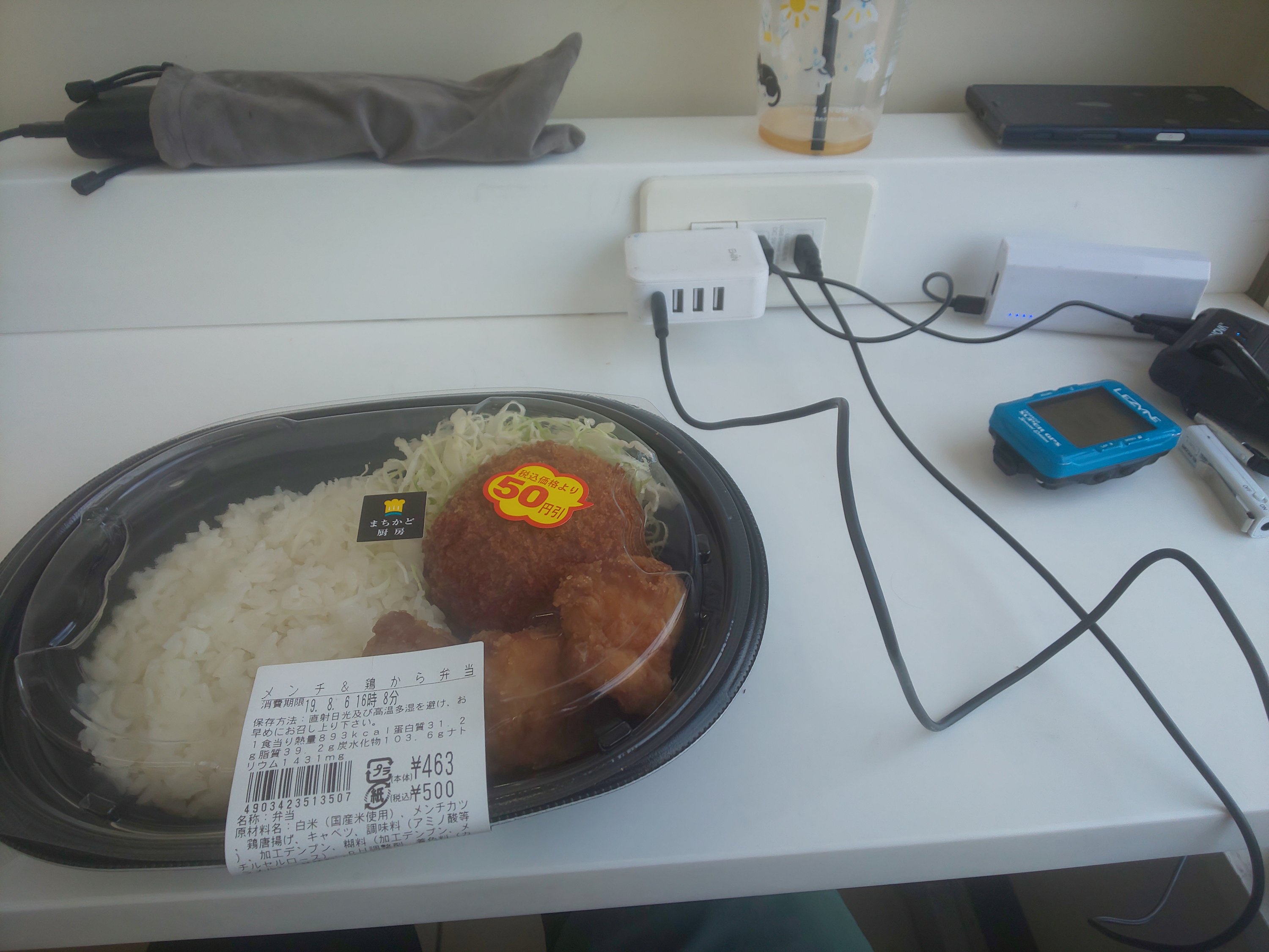 市街地に戻ってイートインコーナーのあるコンビニを探した。そこで、お昼御飯。ここぞとばかり電化製品を充電です。