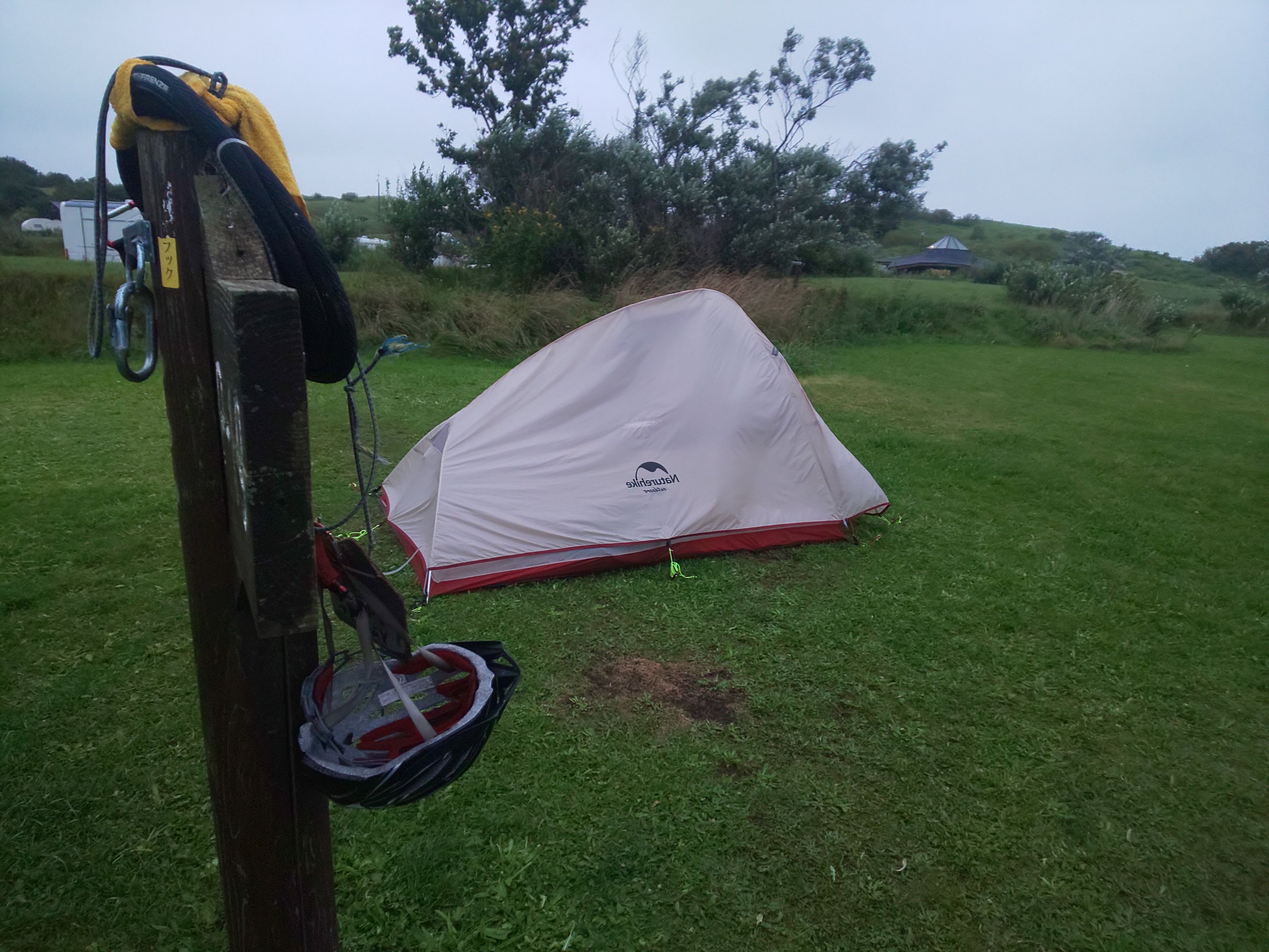 バイクってなんだよ、、自転車はなんなんだよ、、お前は人間かよ、、、都心から離れてしまったので行く先にライダーハウスもキャンプ場もない。ほんとに仕方なく少し戻って『宗谷ふれあいキャンプ場』というところまで戻った。雨の中キャンプ場なんてしたくなかったのだがもうどうしようもなかった。キャンプ場自体は広くていいところ。雨対策にペグまで使って本格的に仕上げております。