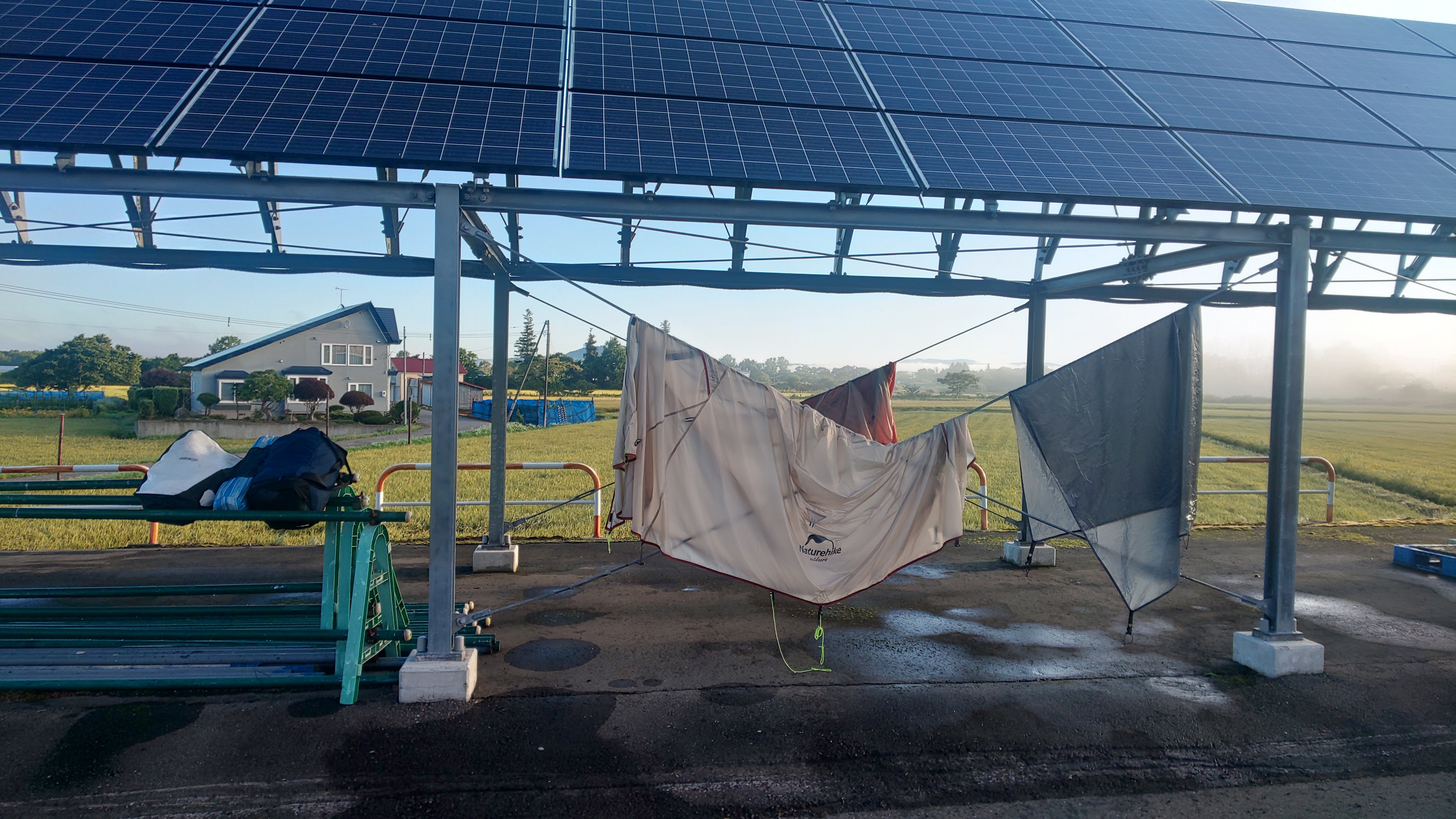 よくみると地面にはナメクジの大群もいてこいつらも夜になんかしていたのかもしれないと思うだけで吐き気がする。地面から離さないと永久に使えなくなるのでこうやってテントを乾かします。