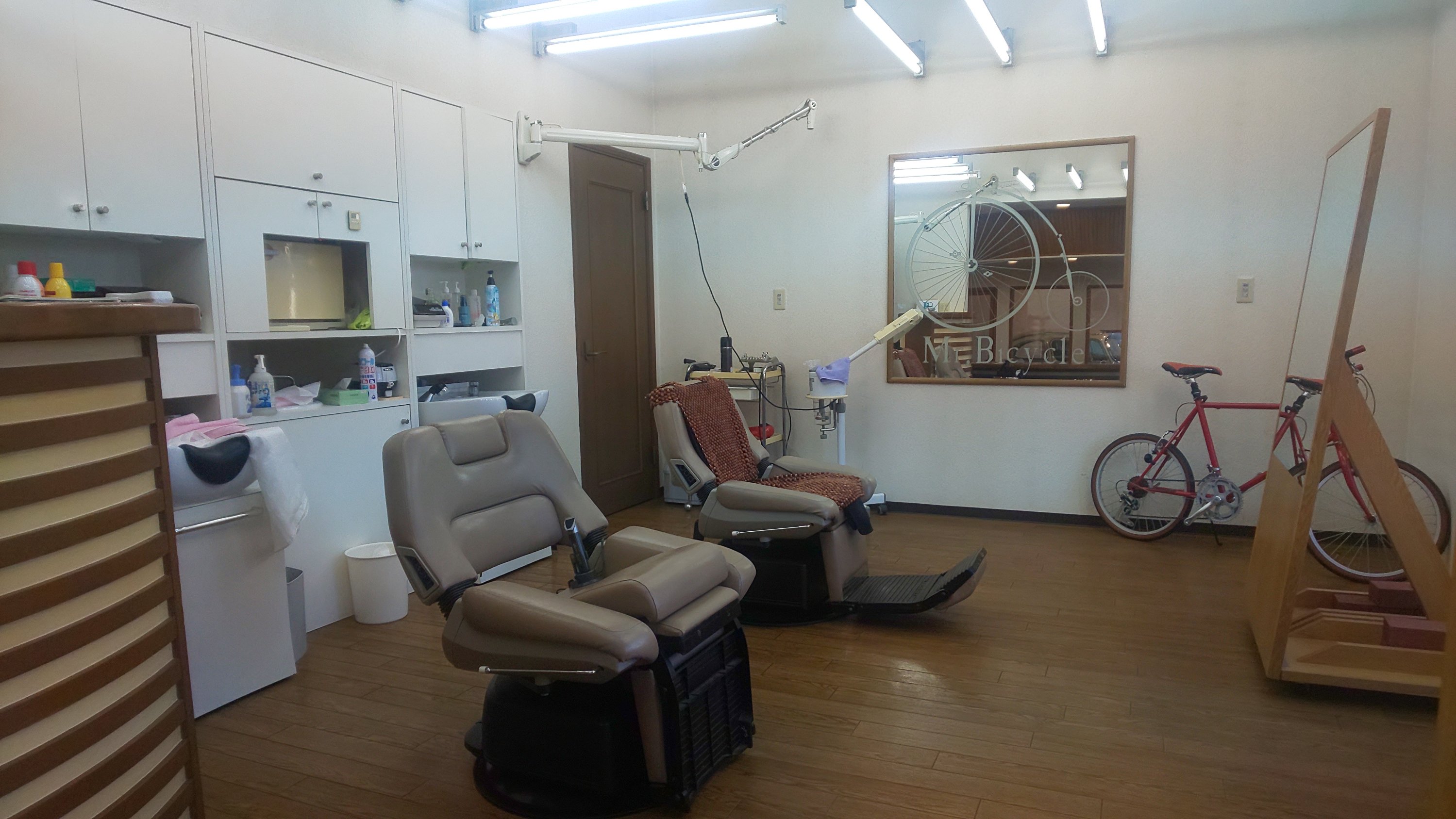 背もたれも後ろに倒すタイプなので美容室っぽいし、おしゃれなカウンターもあって床屋っぽくはないです。