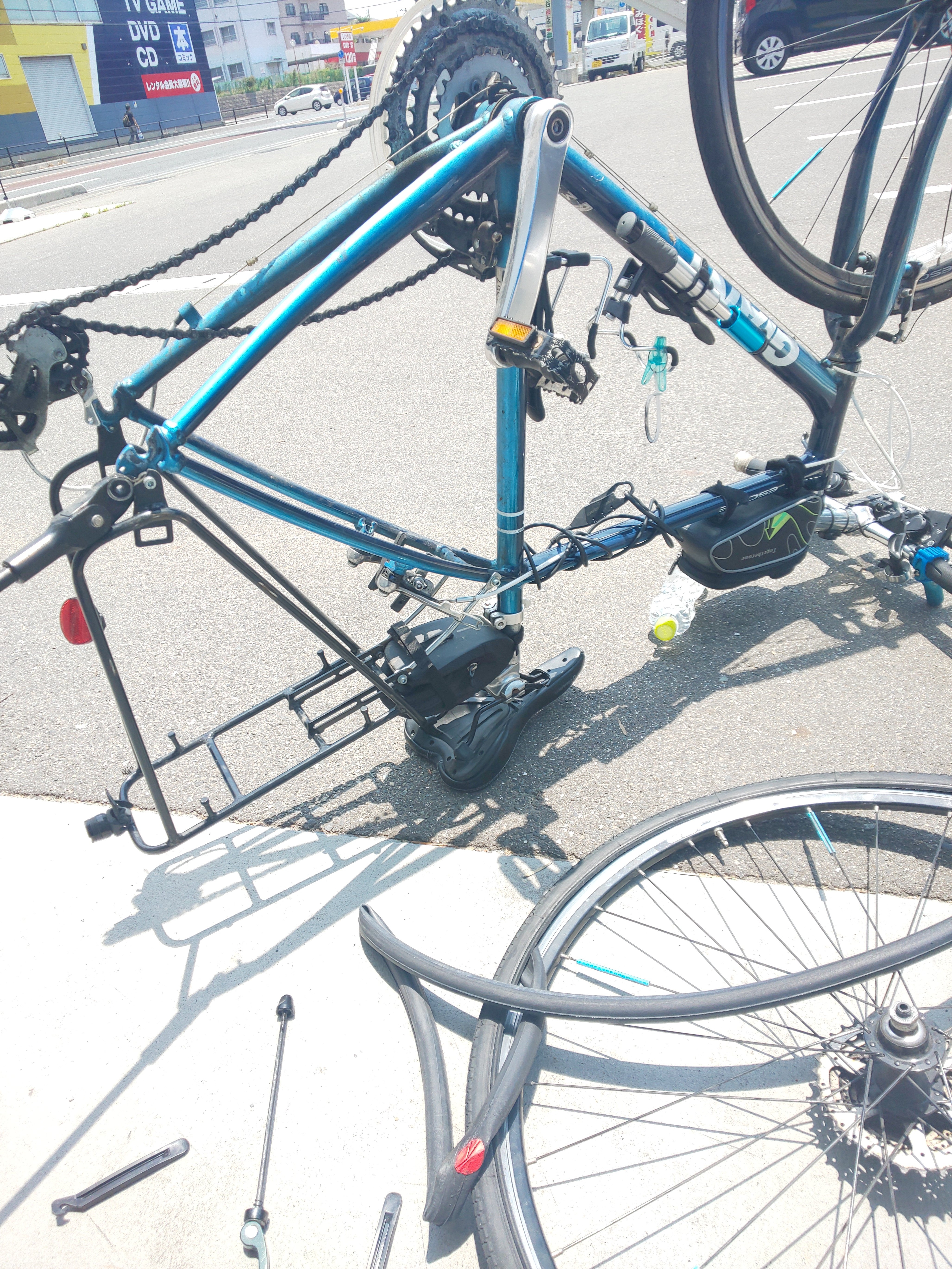 後輪を外さないといけないので、自転車をひっくり返してこんな風にする。