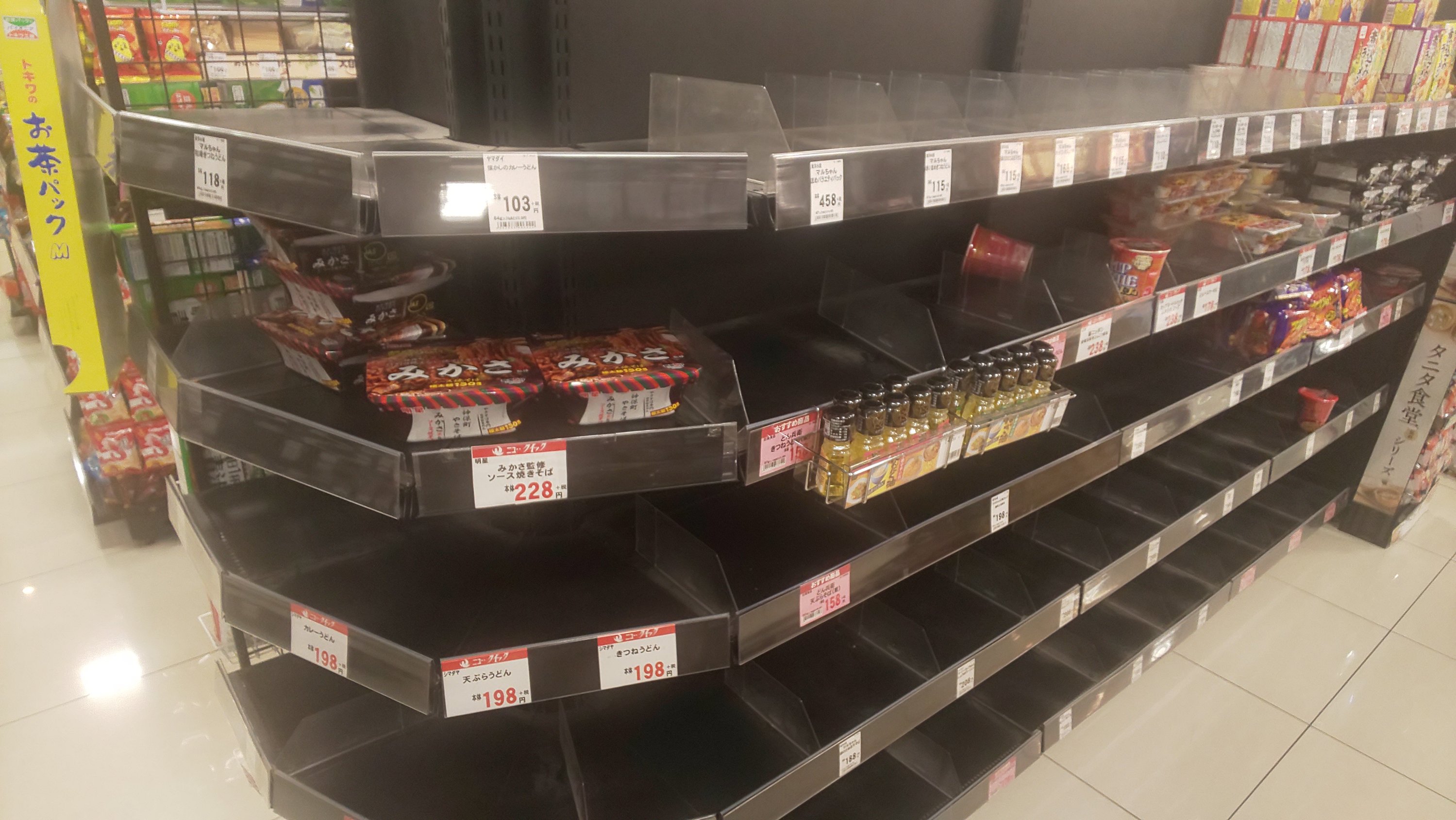 平日の13時頃だったのにレジには長蛇の列。そして驚いたことにカップラーメンのコーナーは売り切れの品が多かった。