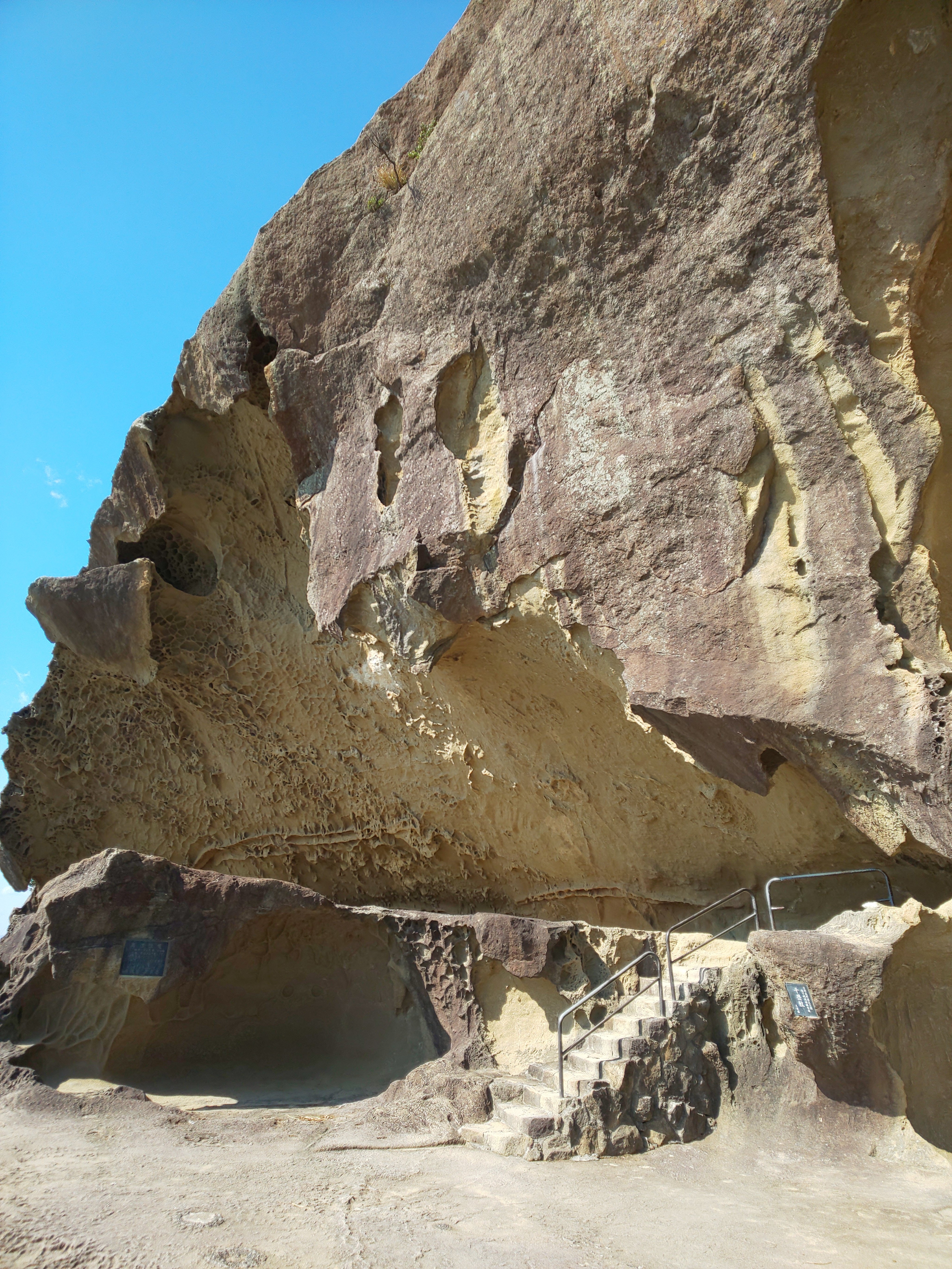 地震による隆起と海風による侵食で岩がえぐられたような形になっている。