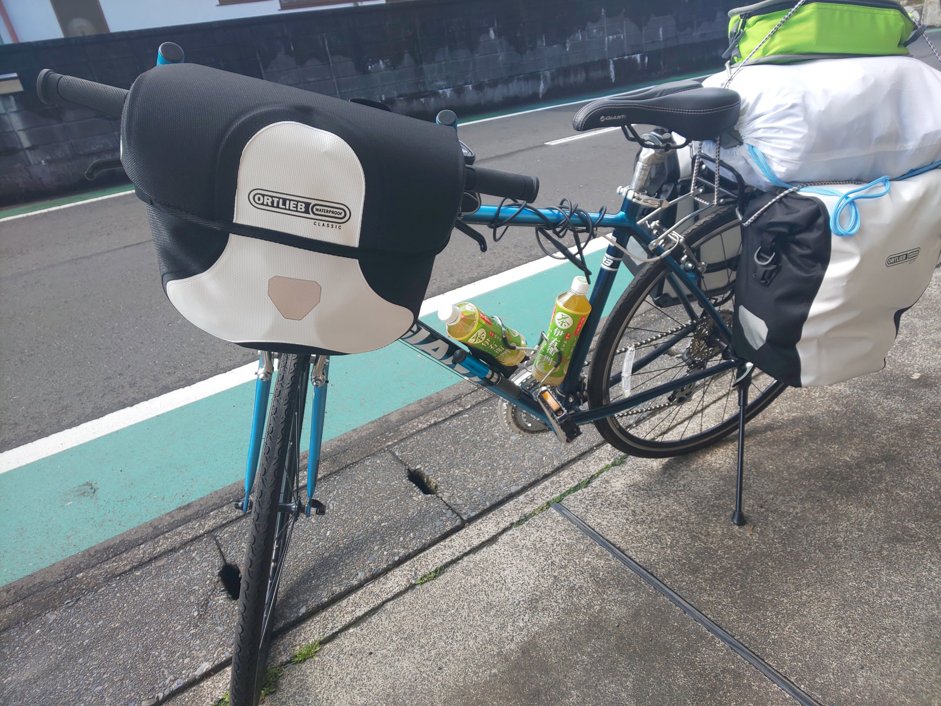 すべての荷物を乗せるとこんな感じになります。荷物が重いので信号待ちで勝手にころけます。