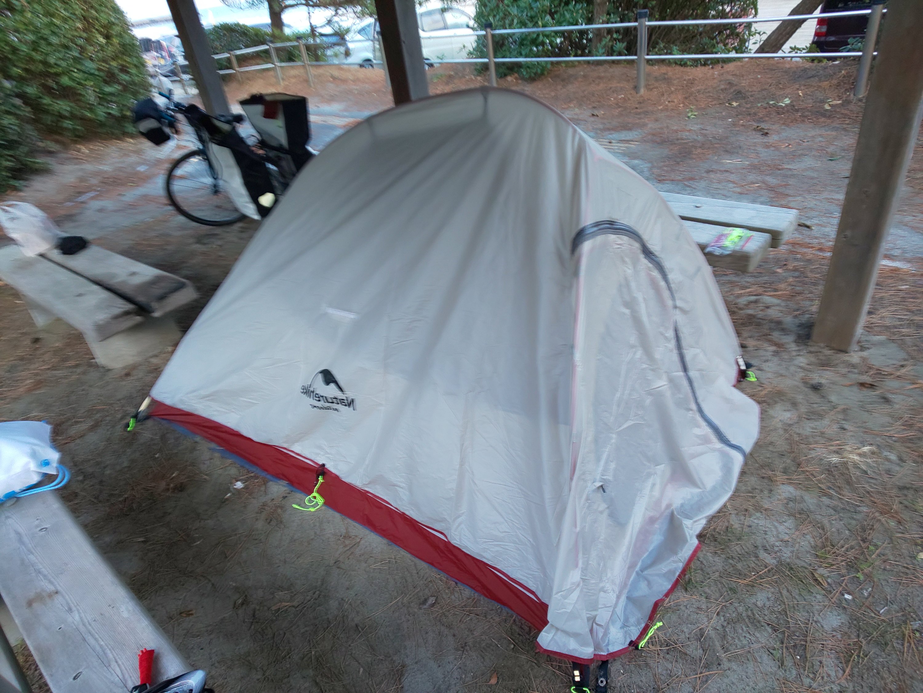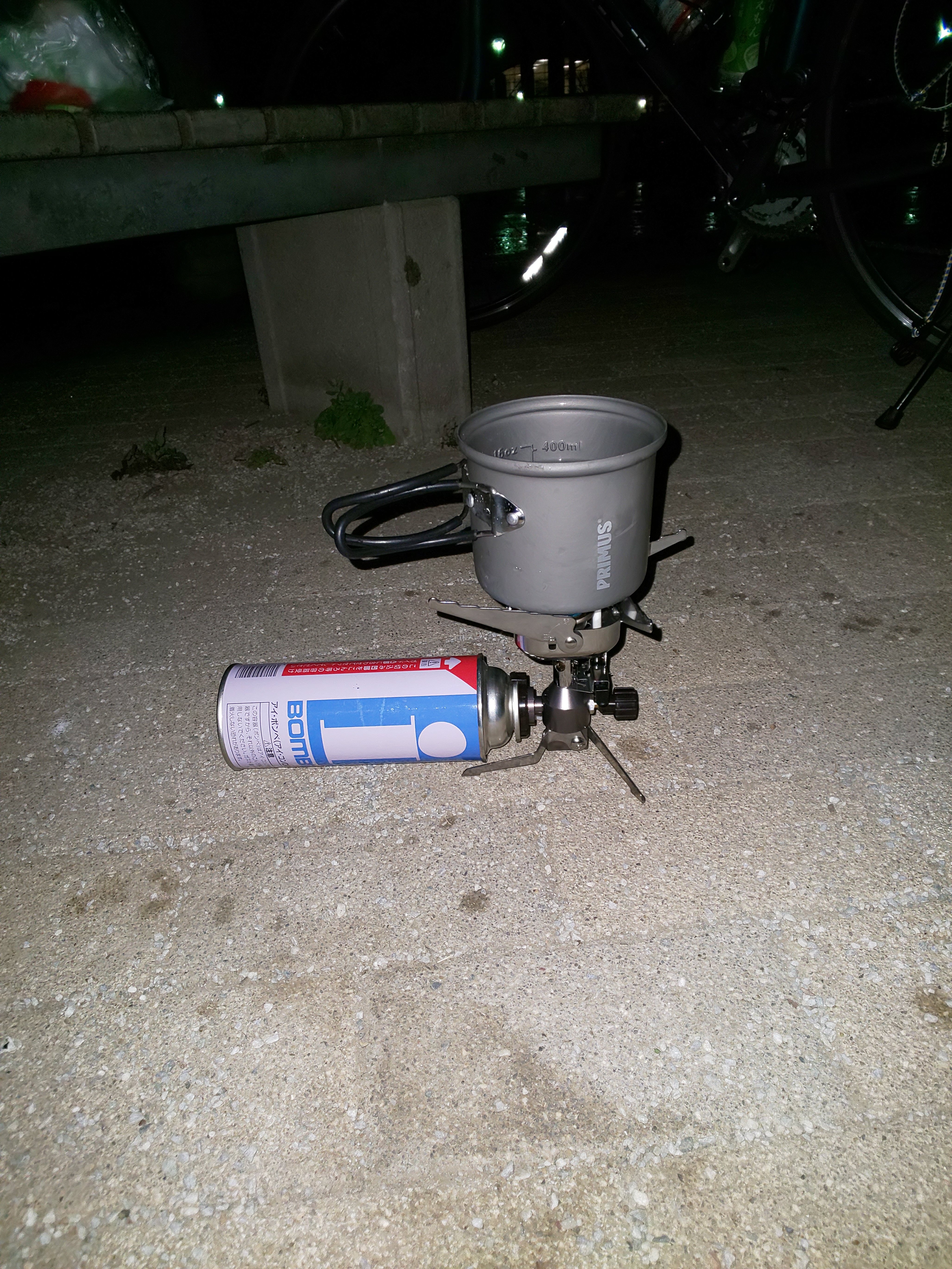 まだ明るかったので躊躇はしましたが、夜営は暗くなる前に準備をするというモットーがあるので準備。犬の散歩をする人やタバコを吸っている人の視線を感じますが作業続行。
