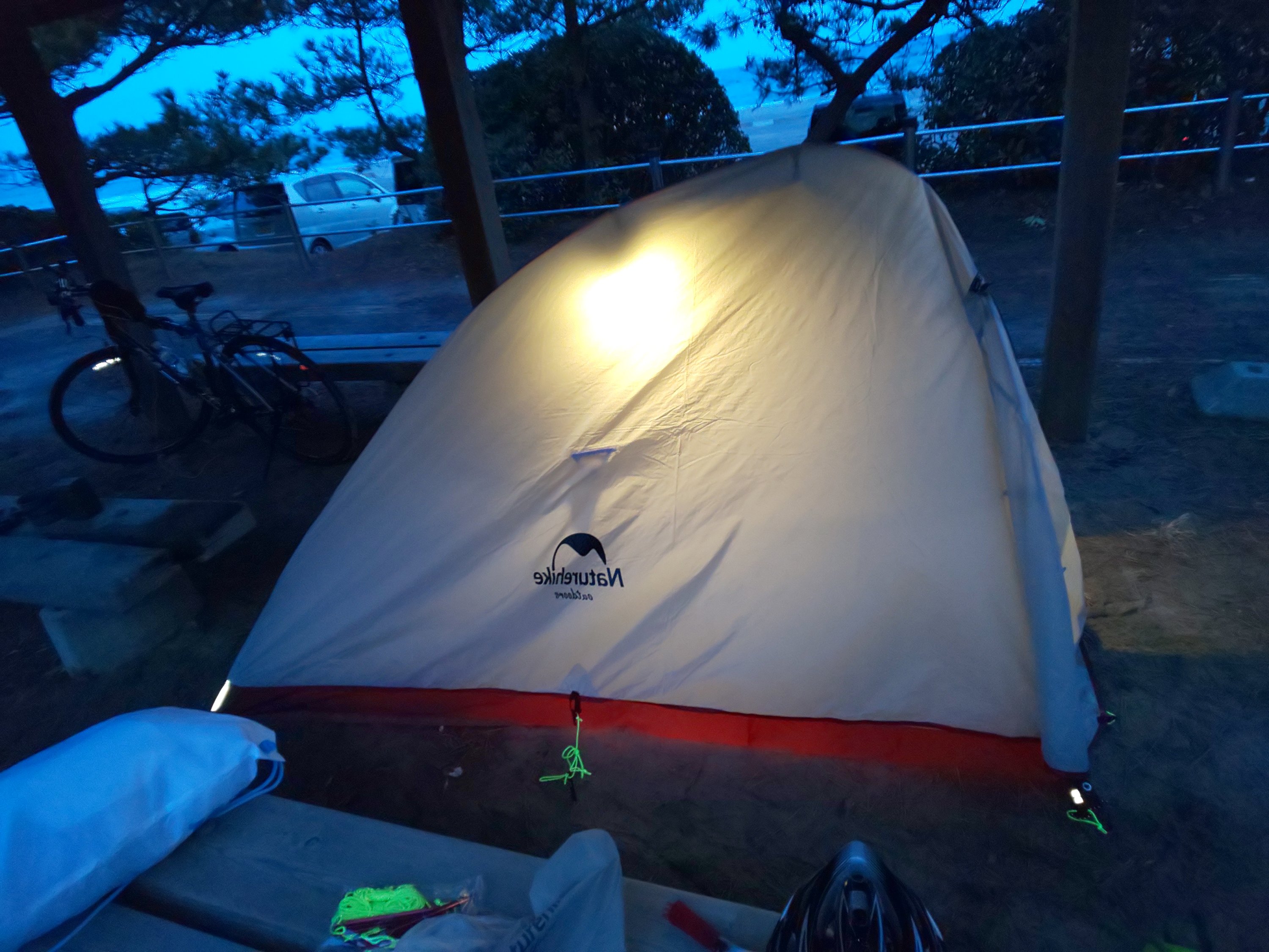 まだ夕方は明るくて、波の音を聞きながら、テントを設営しているときは最高に旅してる感がありました。