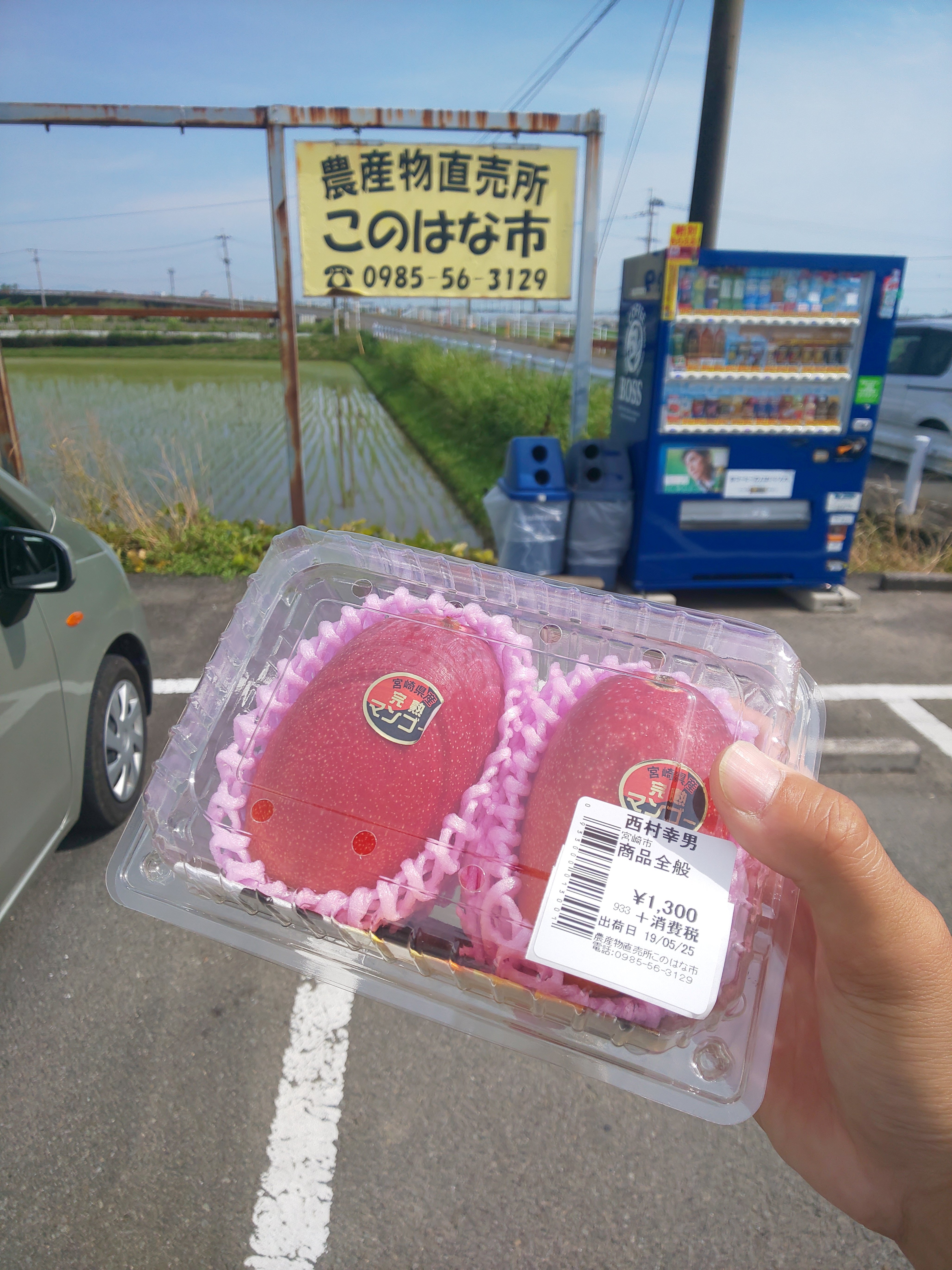 朝御飯の小さいマンゴーでは物足りなく、宮崎市街に入り、市場でマンゴーを買った。一個、1,400円とかする中これがすごくこれがお買い得でした!!