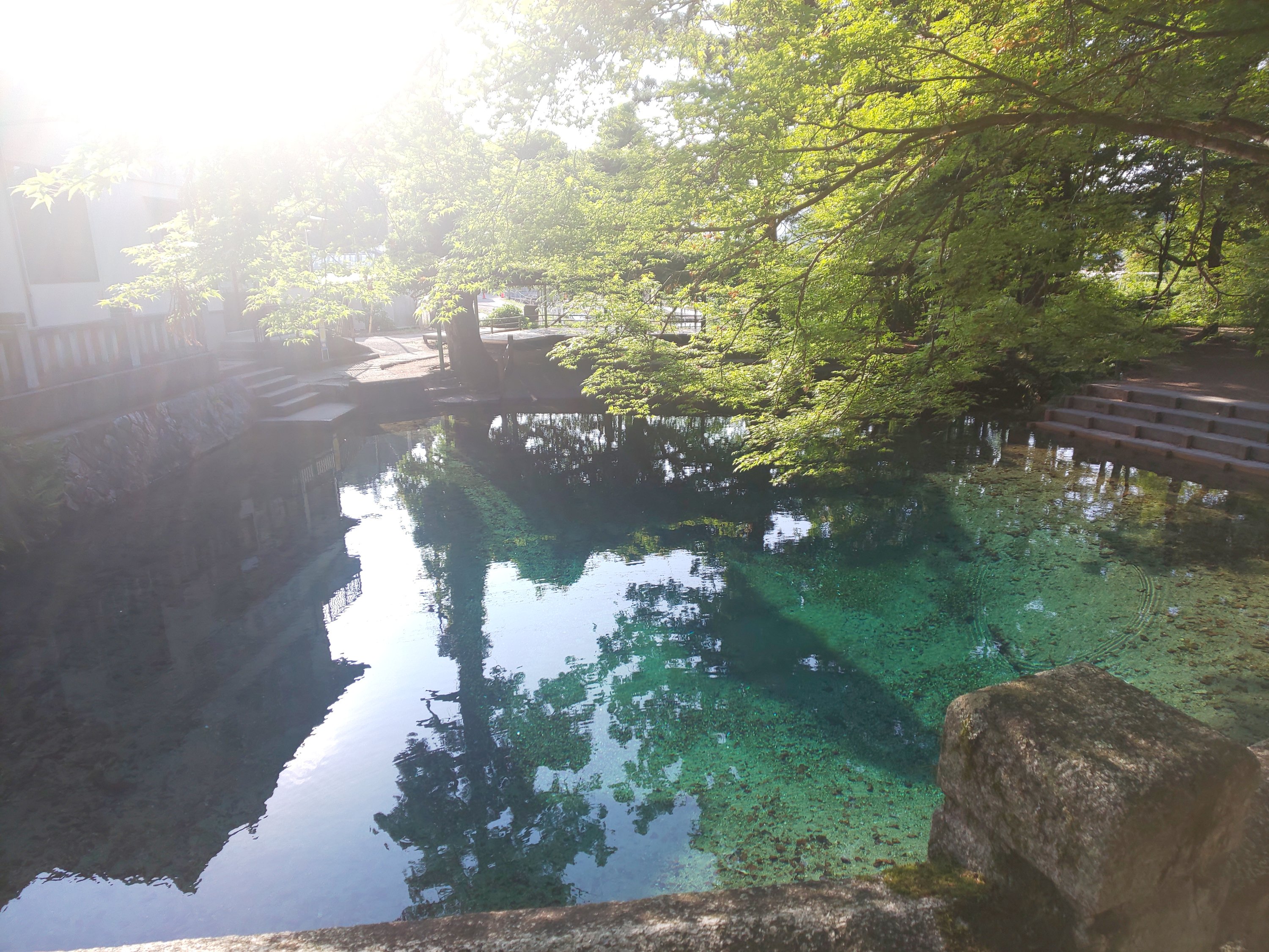 澄み通った湧水を見ながら朝一番で汲んだトイレの水道水を飲んで清々しい気持ちになっていた。