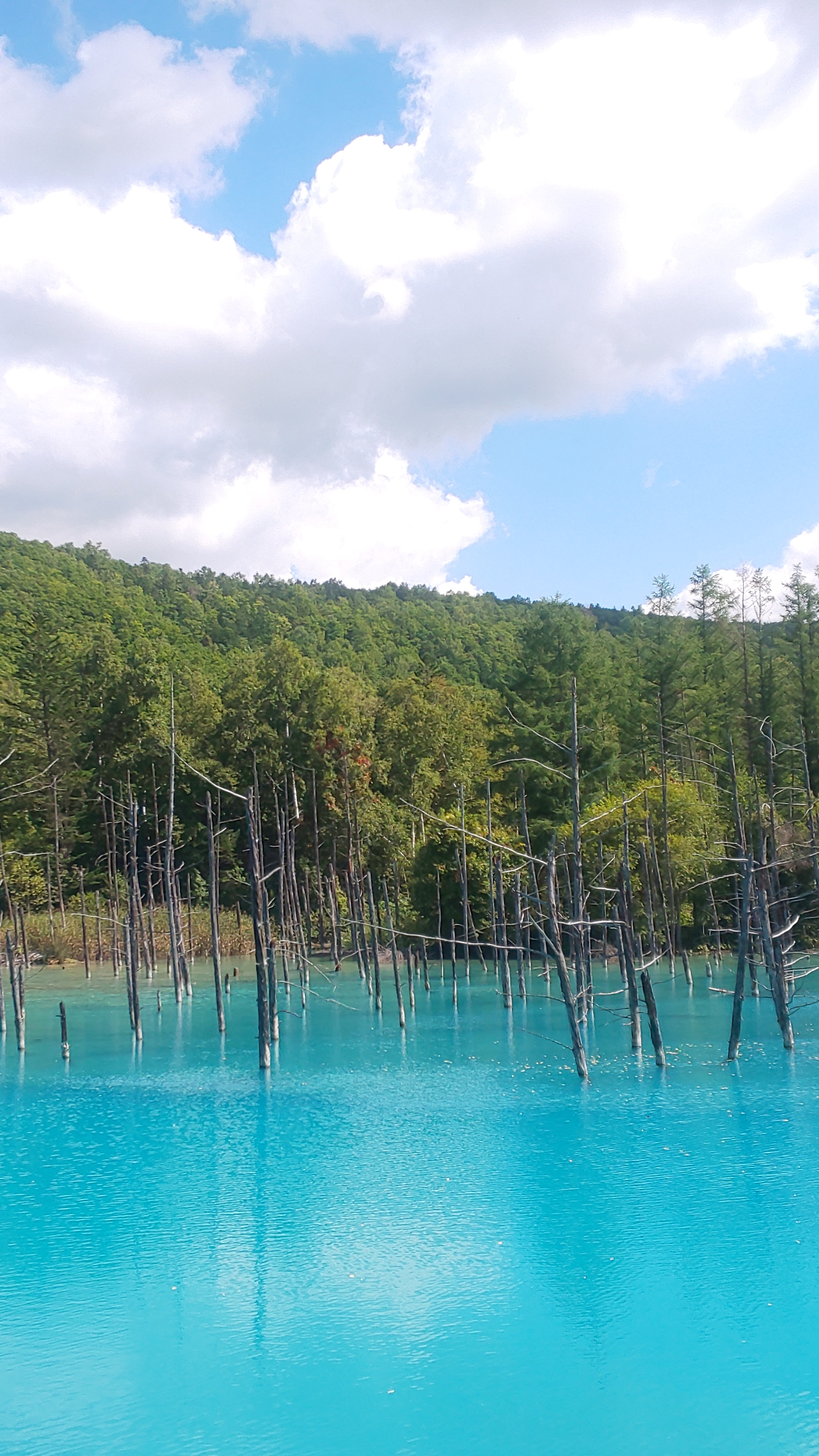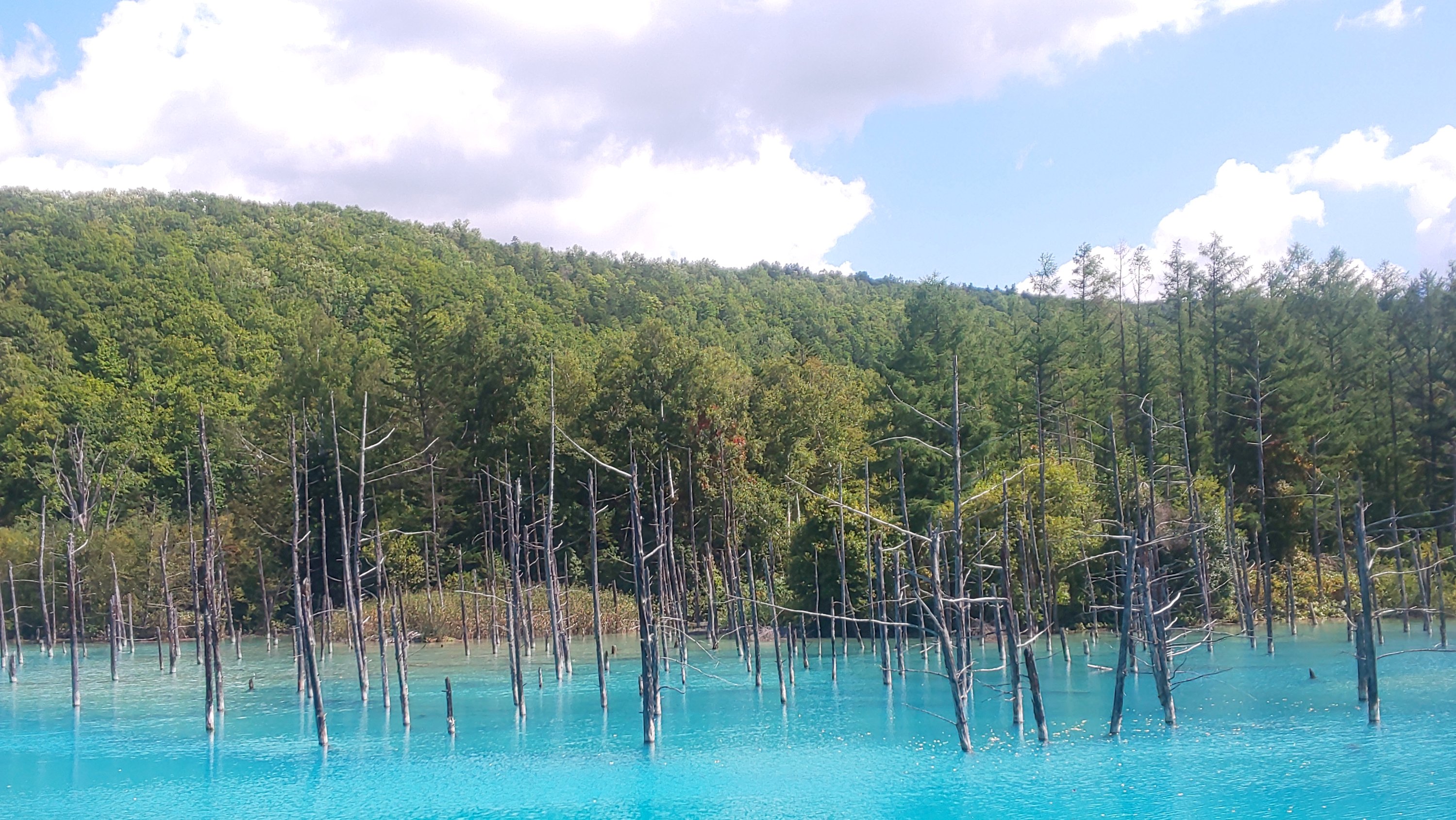 この青い池の水はは白濁しているというか、透明ではない青(コバルトブルー)!って感じの色です。そこがまた神秘的な風景に見えるのでしょうね。