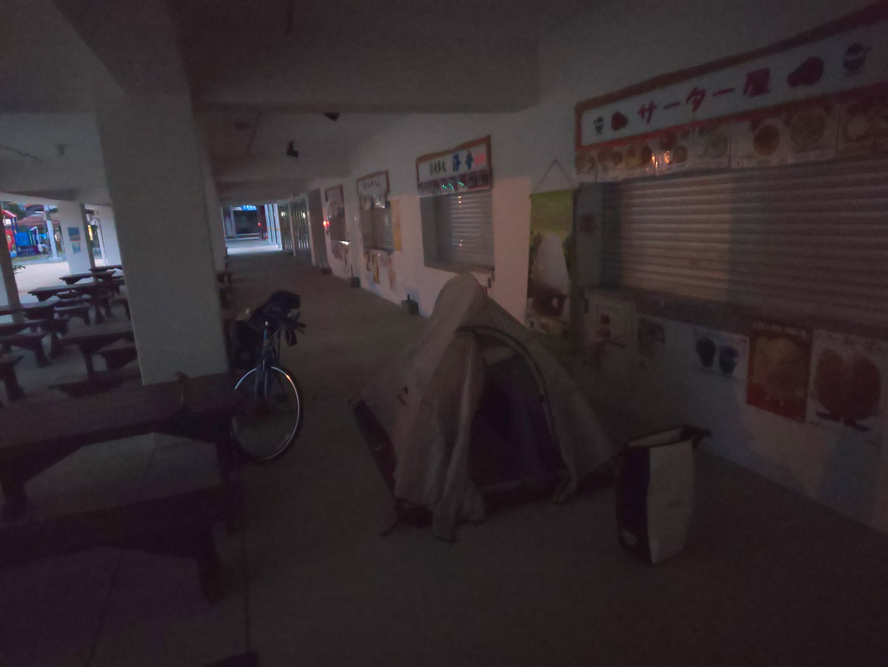 昨晩、深夜1時に島民の方の大きな話し声で起きた。てっきり、テントの中の自分に向かって話しかけられてると思いテントから出たが、公衆電話で誰かと話しているだけであった。(方言がきつくて何て言ってるかわからなかった。)