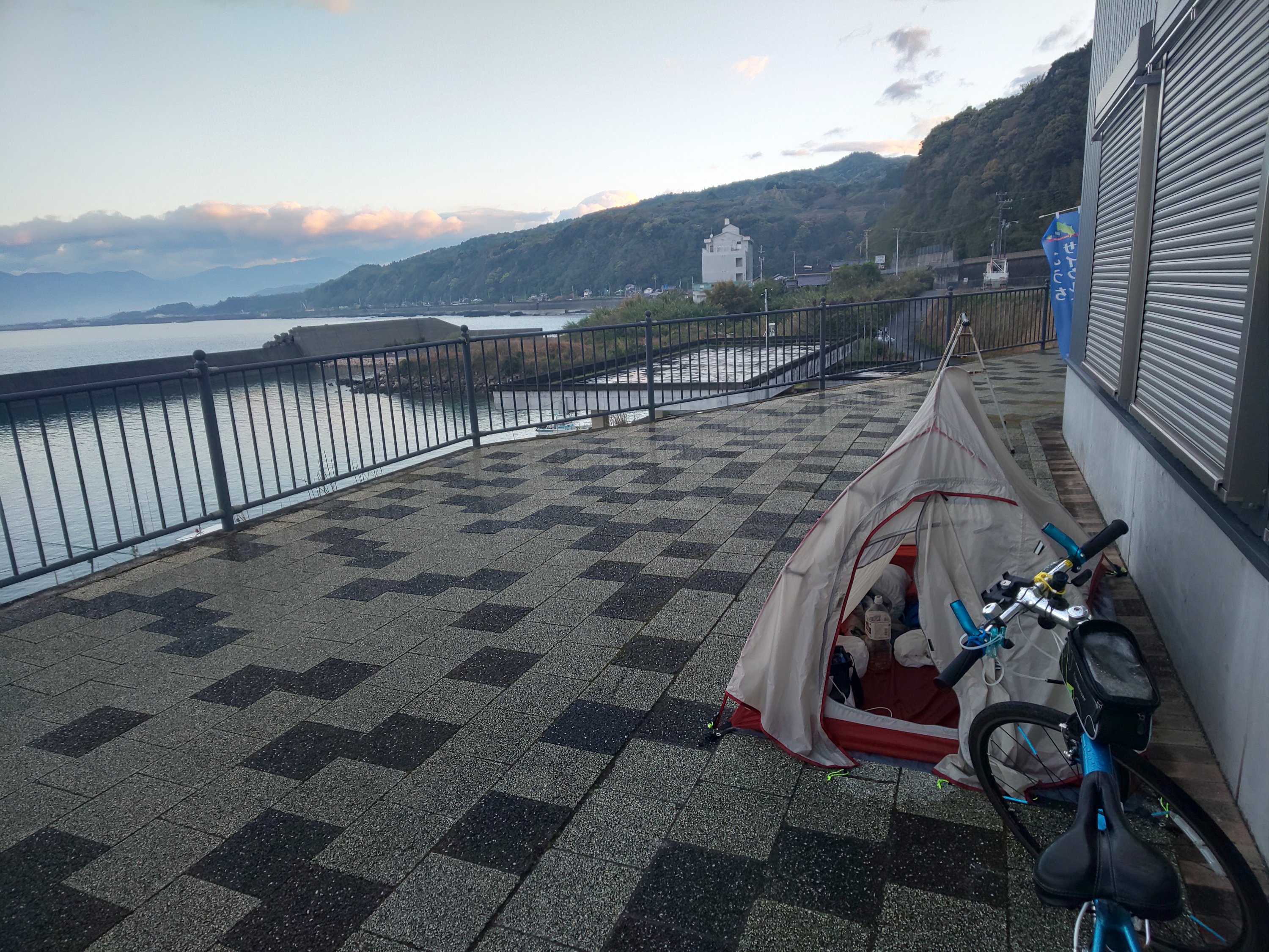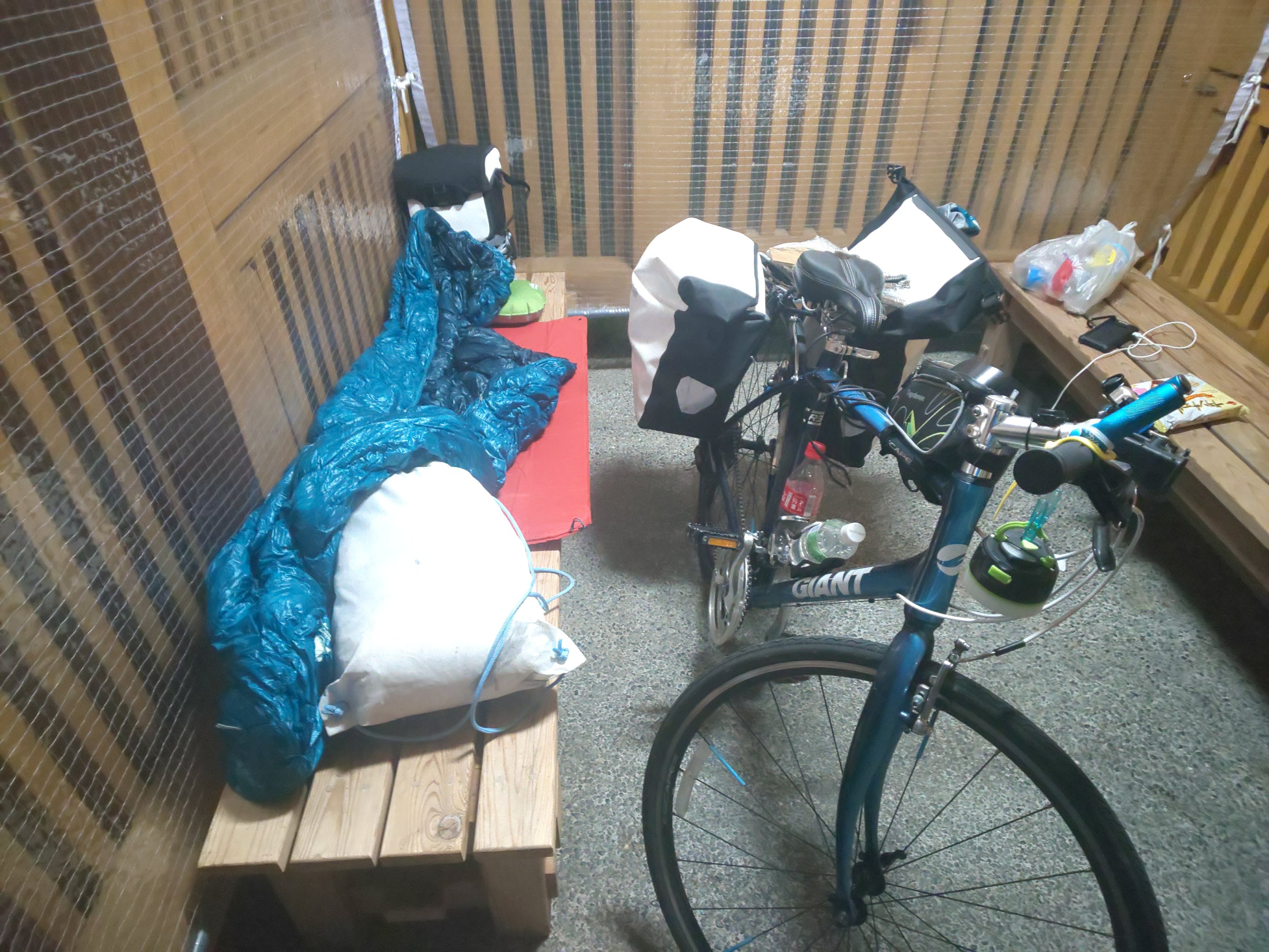 1日で100キロ以上走ったので疲れが酷くて寝床を探す。そうしていると、チャリダーの人とセニアカーに乗ったおじいさんが小屋みたいなスペースで話していた。セニアカーにゴミみたいのが多くのっているので、そういう人と旅人のチャリダーが話しているんだろうと思った。