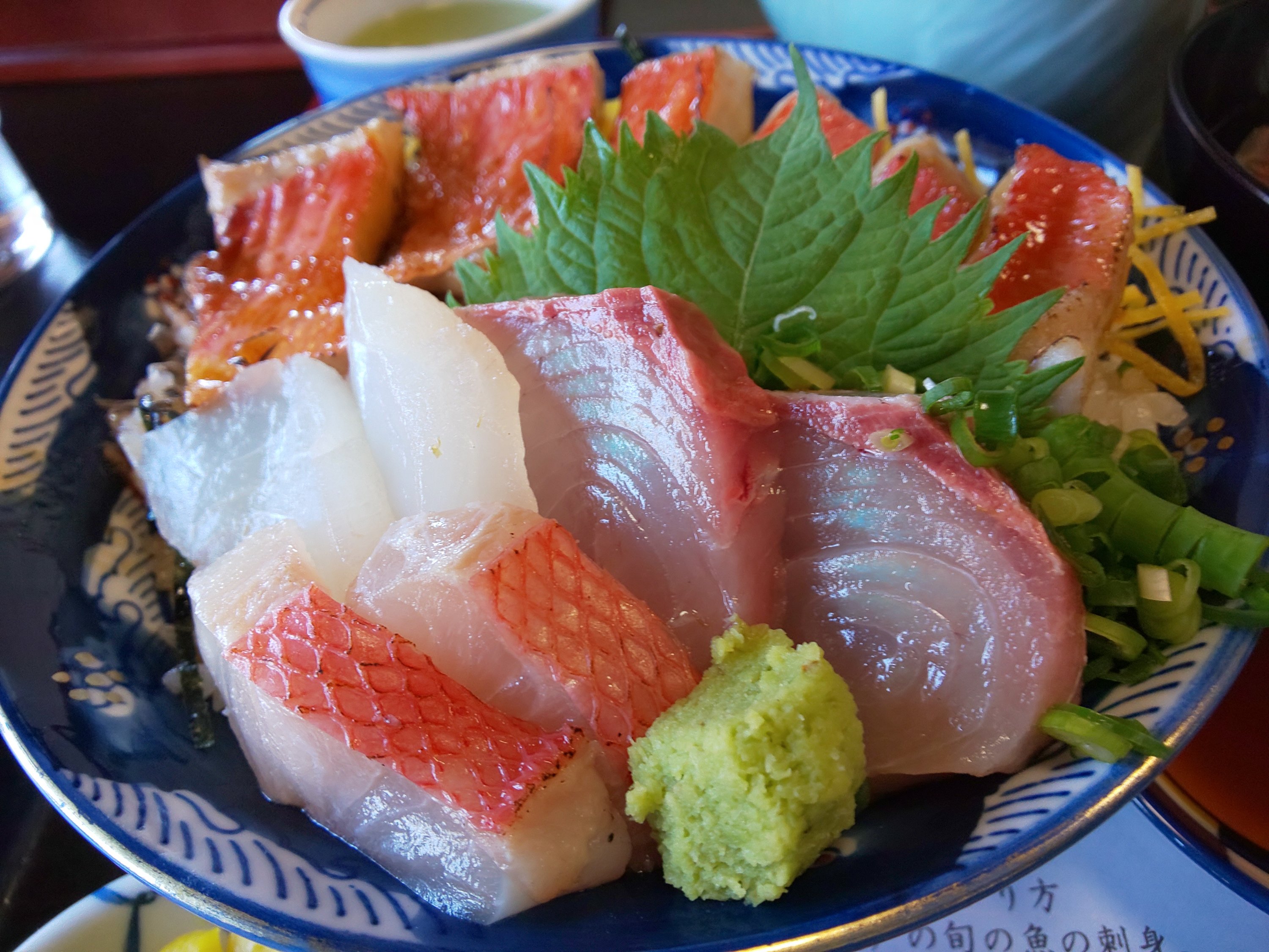 目的のキンメダイを使ったキンメ丼を食べる。キンメダイの刺身となんかの刺身2種類、キンメダイの照り焼きが乗っている。中でも照り焼きが美味しかった!