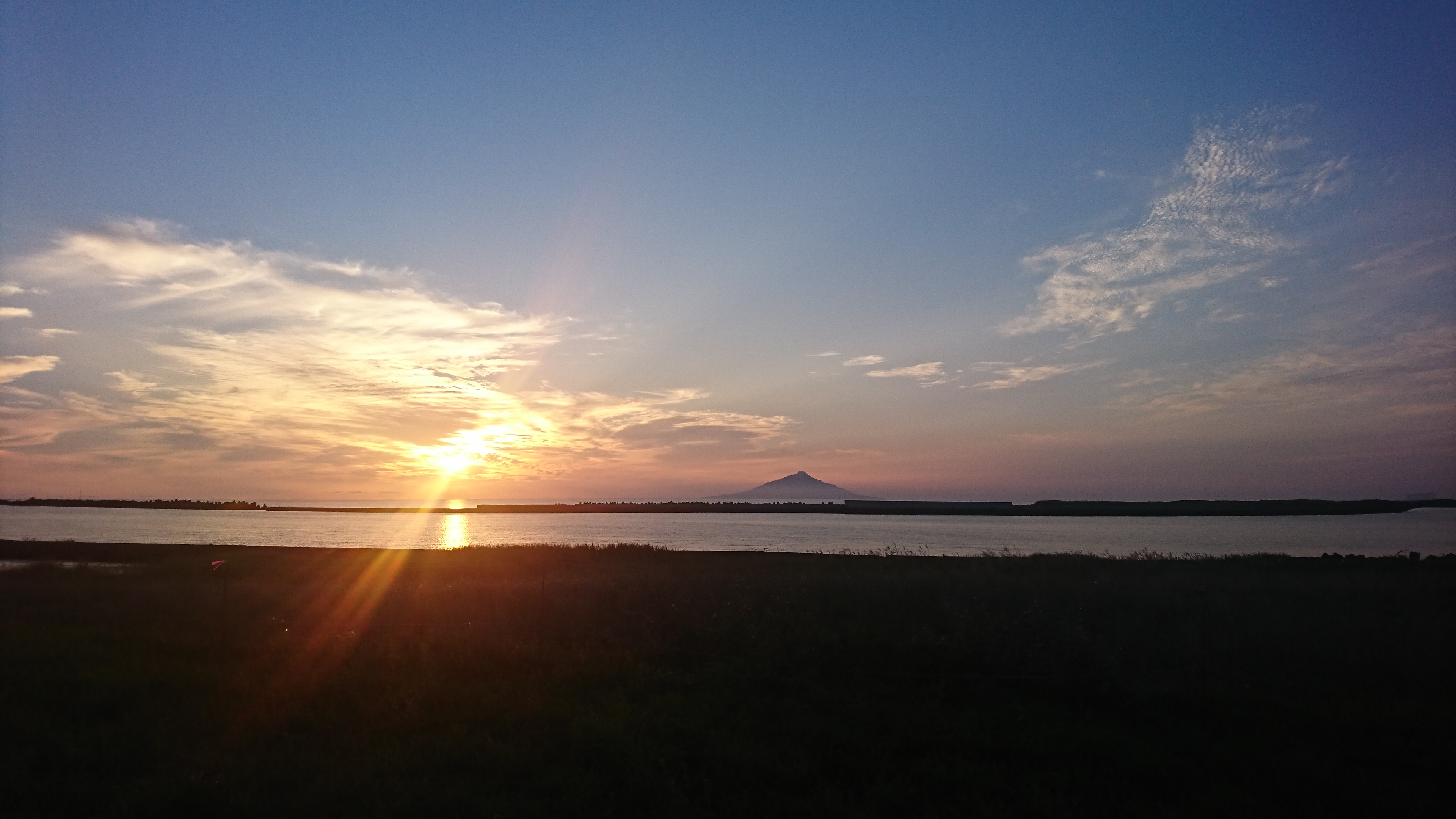 利尻島という島にある利尻富士が奥に見えて夕日とマッチしてます。