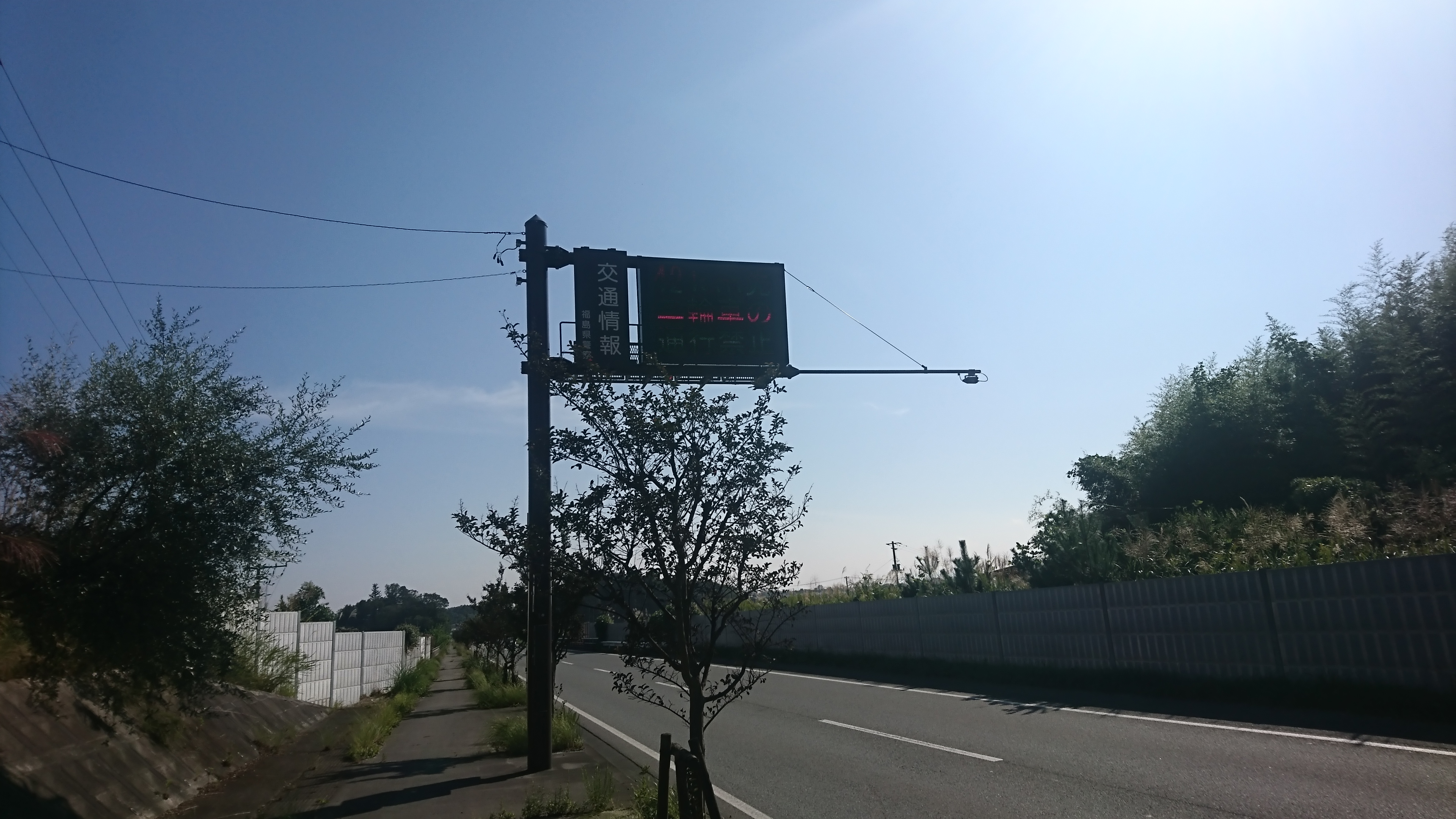 電光掲示板と逆光のせいかな?文字がみえないですが、『この先42キロ 二輪車 通行禁止』って書いてあったんですよ…
