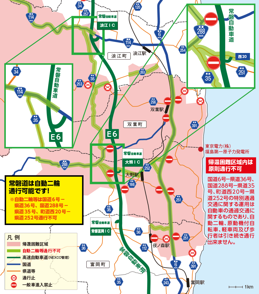 福島原発事故で浜通りは浪江町から先は二輪車は通行禁止でした。私もいわき市に向かっていたのですが、南相馬まで戻り、県道12号を川俣町へ向かい国道349号から国道49号、国道6号からいわき市に入りました。その距離約100キロの遠回りとなります。県道を使ったルートもあるようですがアップダウンを考えれば上記が無難ではないでしょうか。