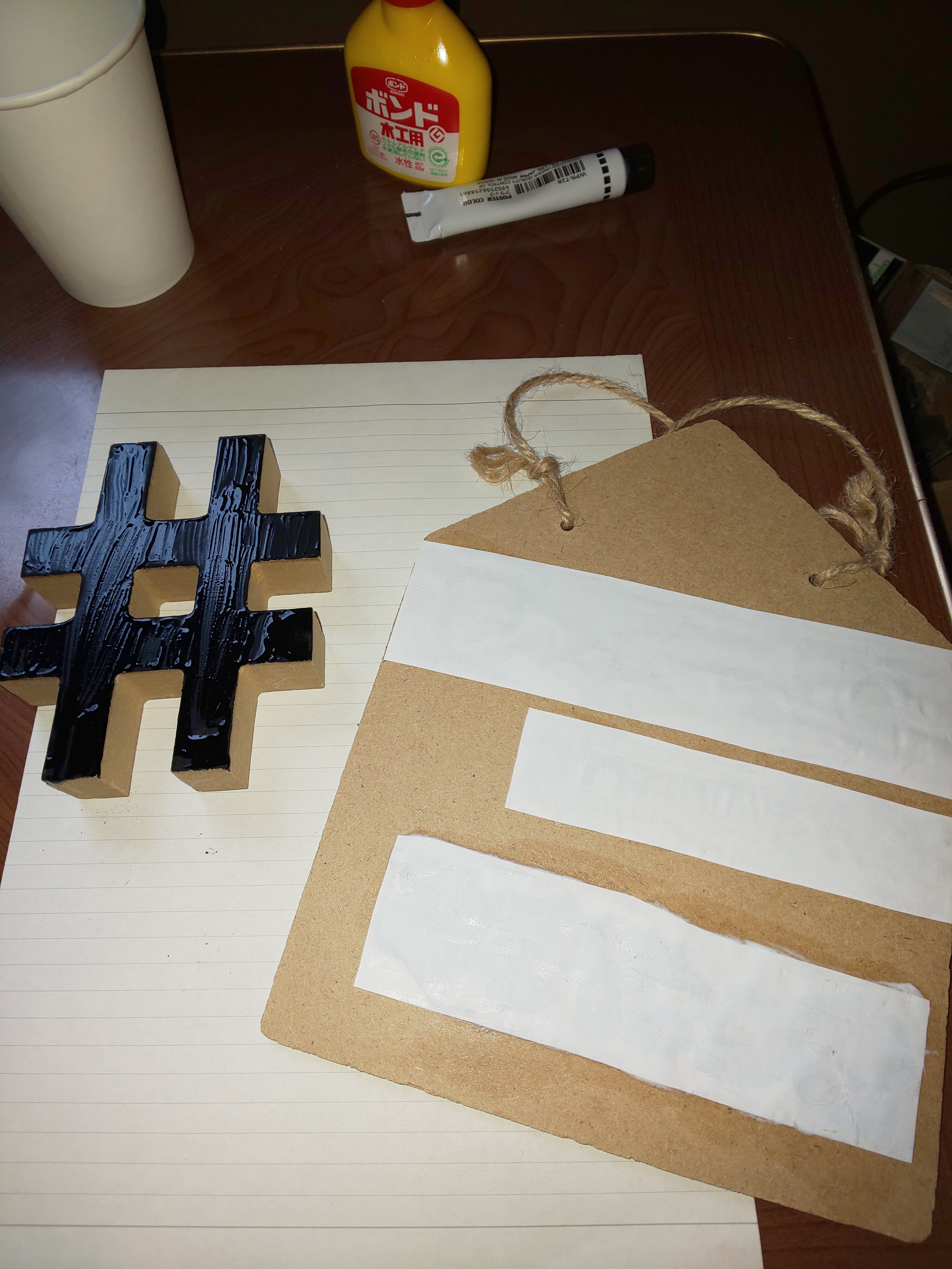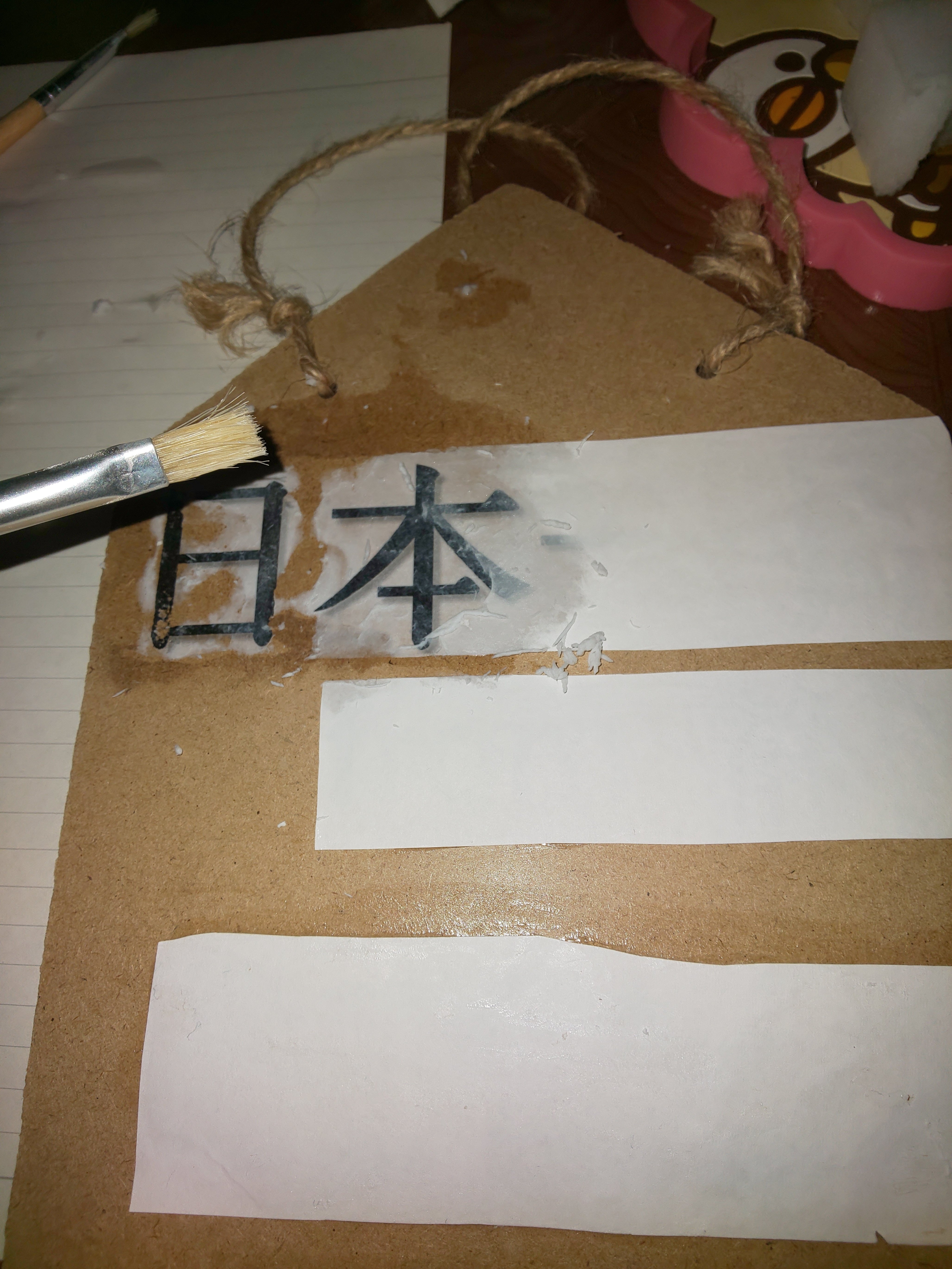 そして、紙の文字が印刷されている面にボンドを均一に塗り、看板につけます。