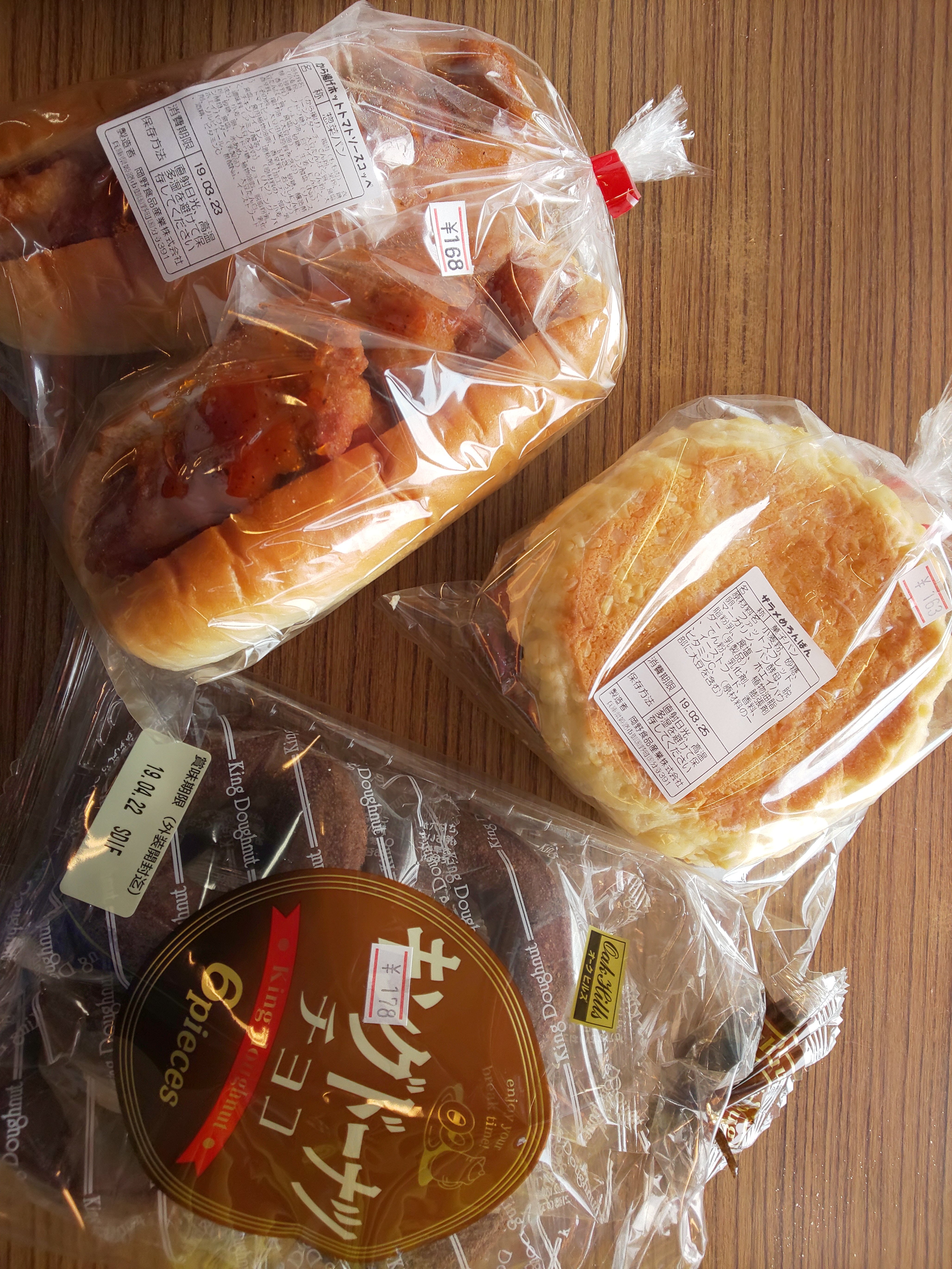 小腹が空いた時用に。と思い唐揚げを挟んでるコッペパンとなんか平たいメロンパンとドーナッツを買いましたょ。