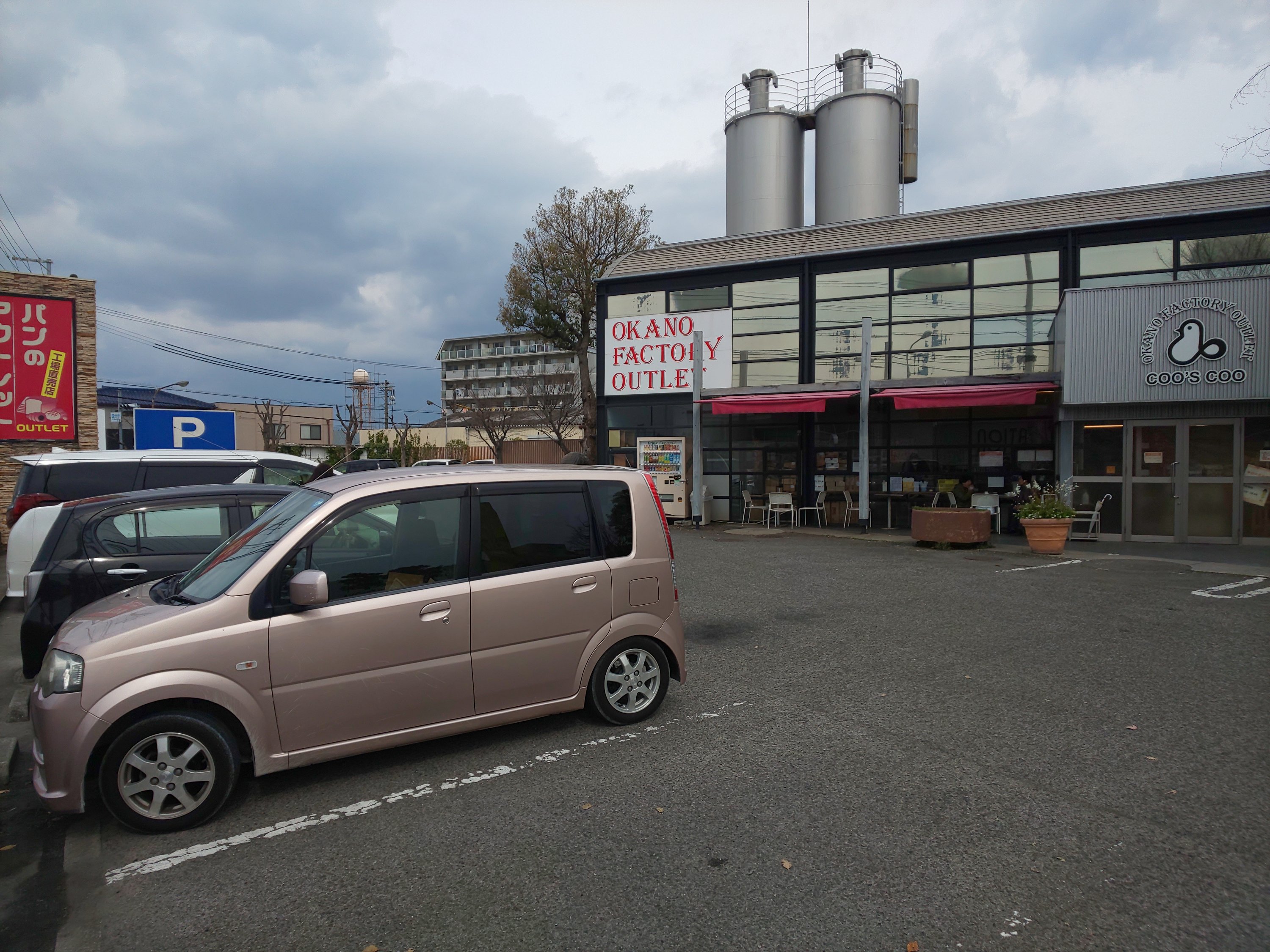 おにぎり1つだけではお腹が空いてきてまたおにぎりでも買おうかなぁと思ってたときに、パンのアウトレットという看板を見つけた。『オカノファクトリーアウトレット』というお店らしい。朝なのに車の往来も沢山あり、安そうなので朝御飯を探しに入ることに。