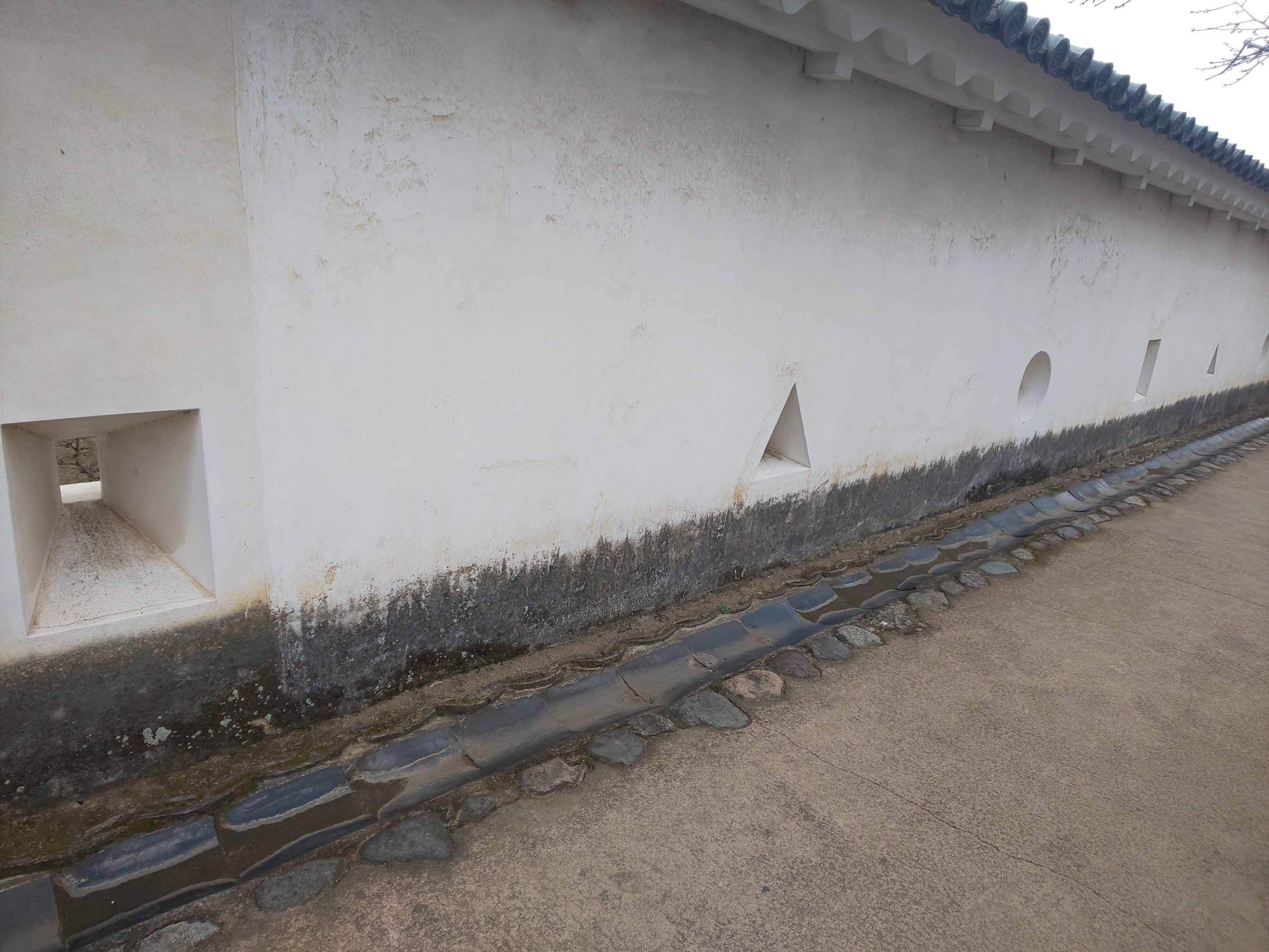 城壁には至るところに狭間【さま】と呼ばれる穴がある。これは城を守るときに矢や鉄砲をこの穴から撃つそうです。内側が広く、外側が狭いのは内側の攻撃は角度の調整ができ、外からの攻撃は中に通しにくくするためです。