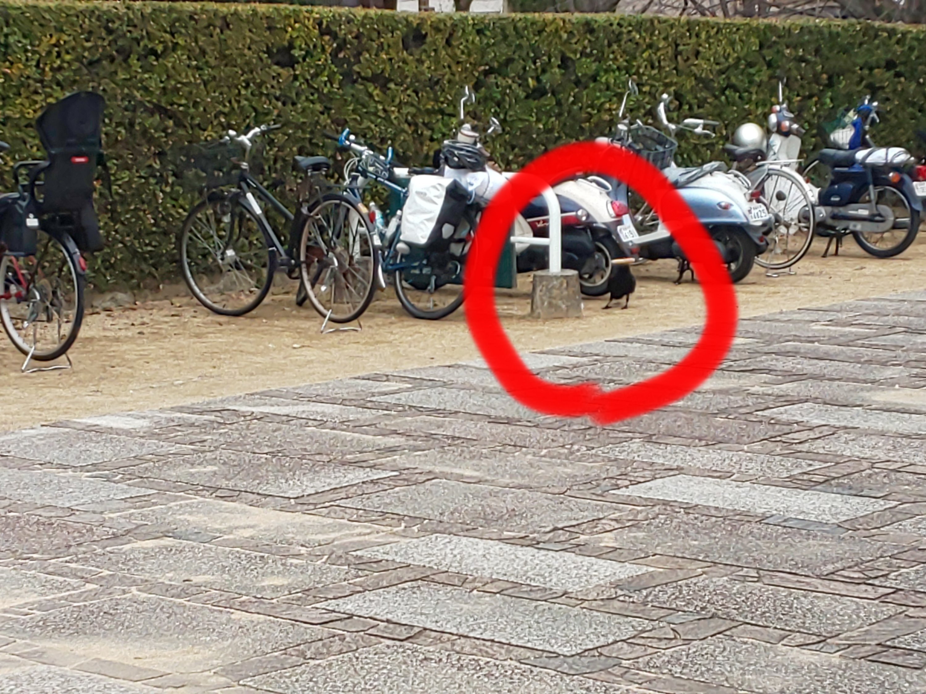 (自分の自転車にめっちゃ烏集っとるわぁ。。)