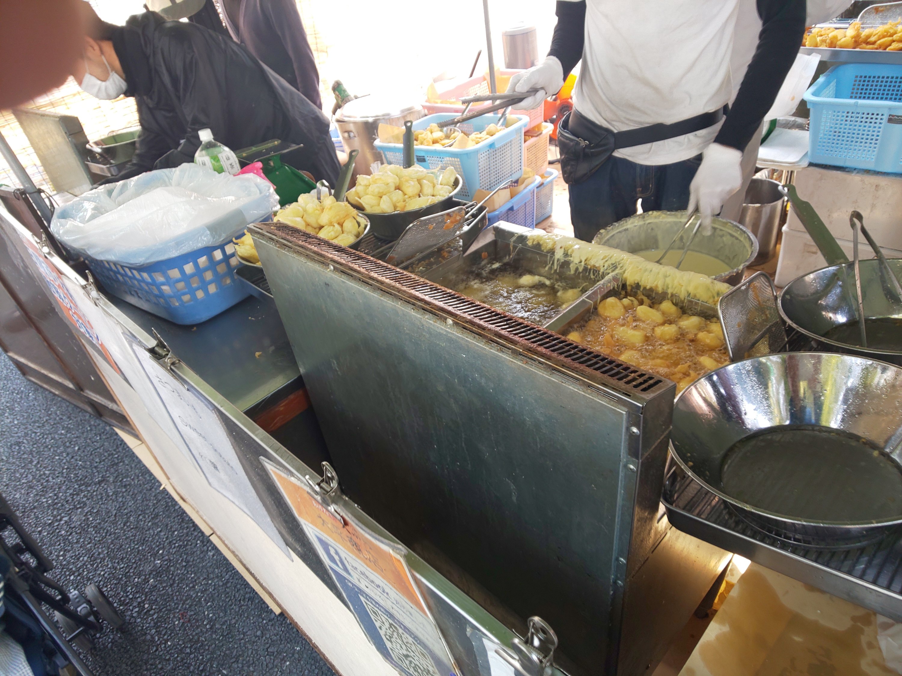 そして、お目当ての『いも天』屋さんにたどり着いた。日曜市の出店のなかでトップクラスに列が並んでました。