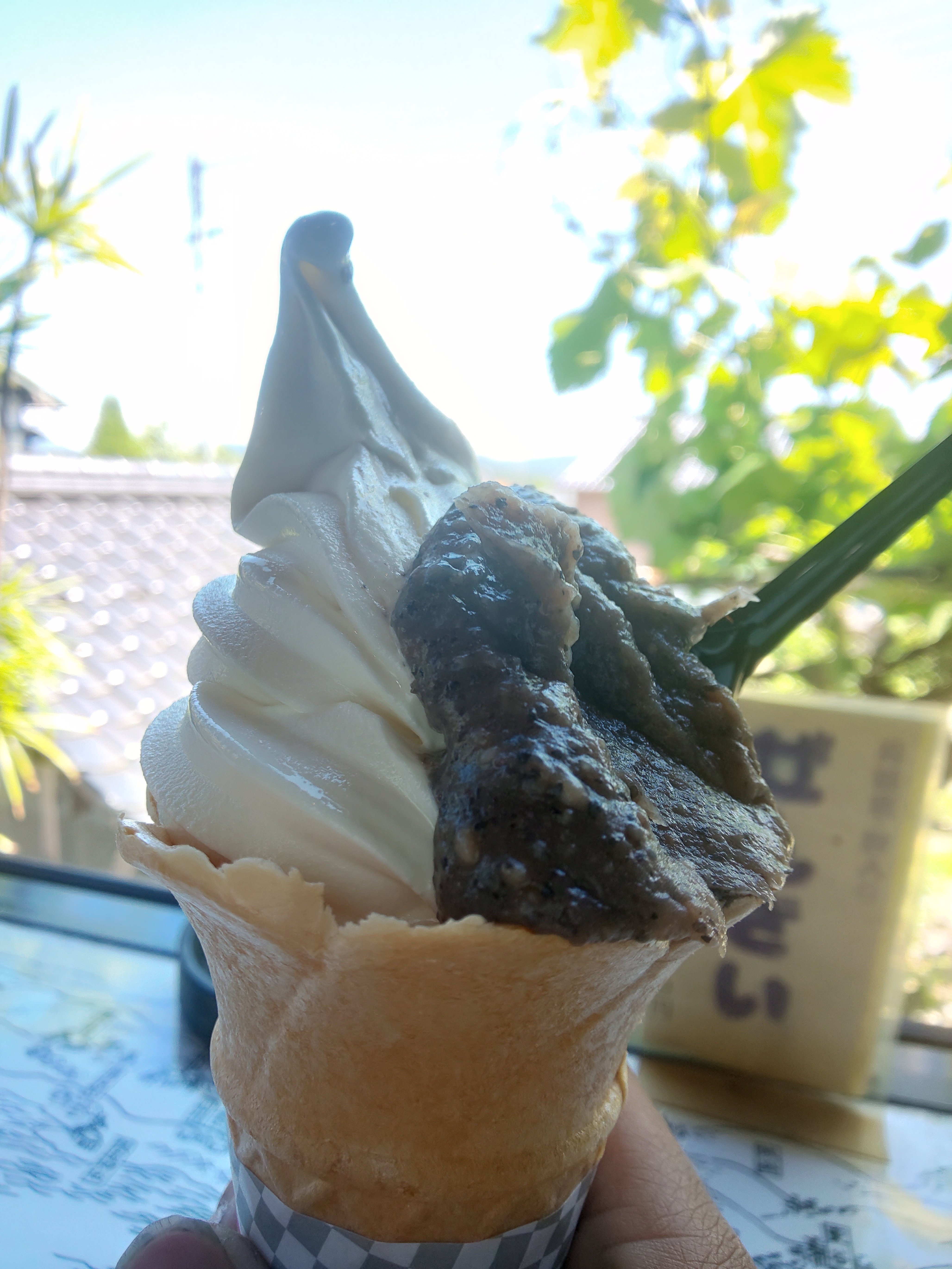 バニラのソフトクリームに黒豆のあんこが乗っているソフトクリーム。