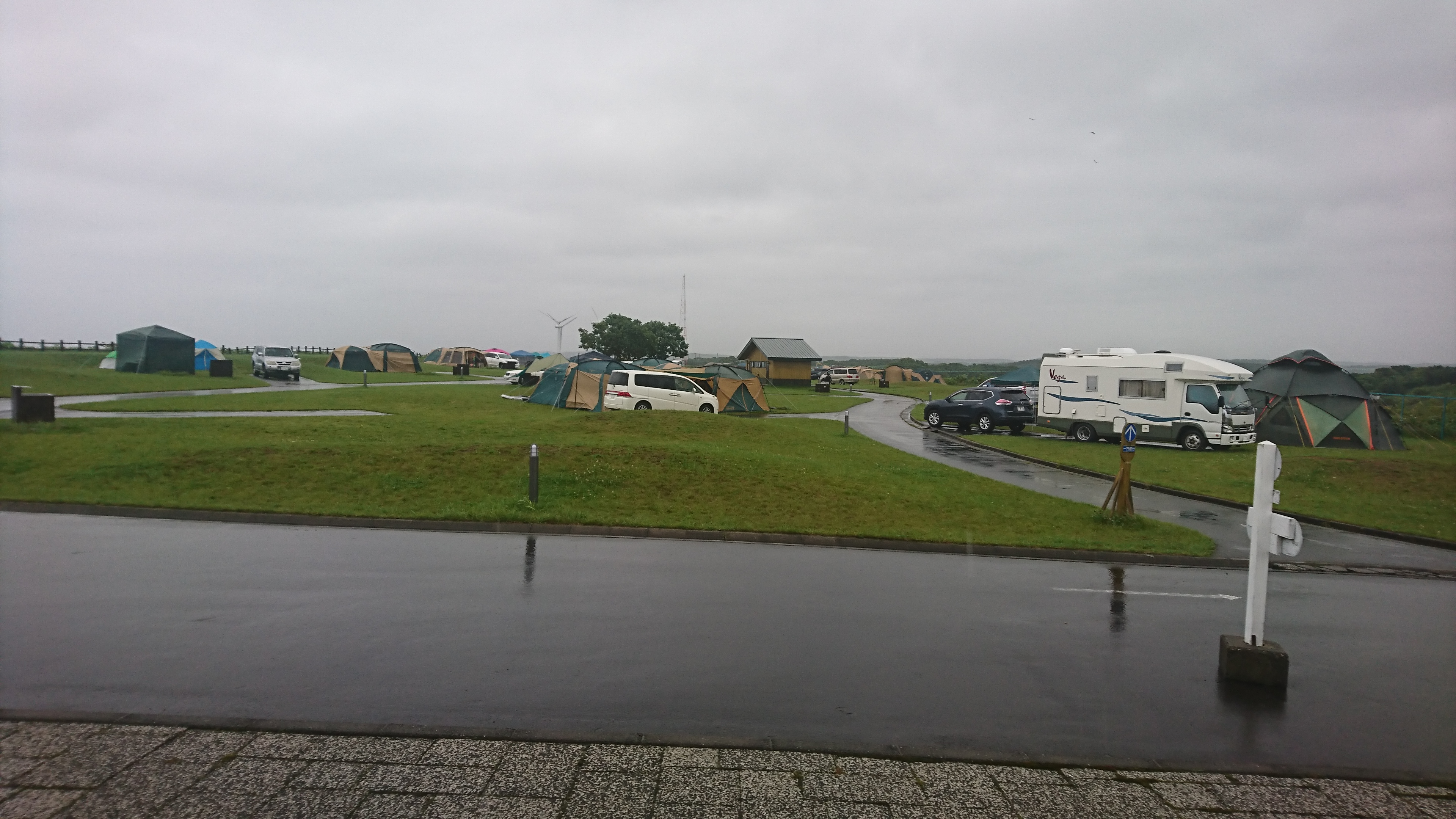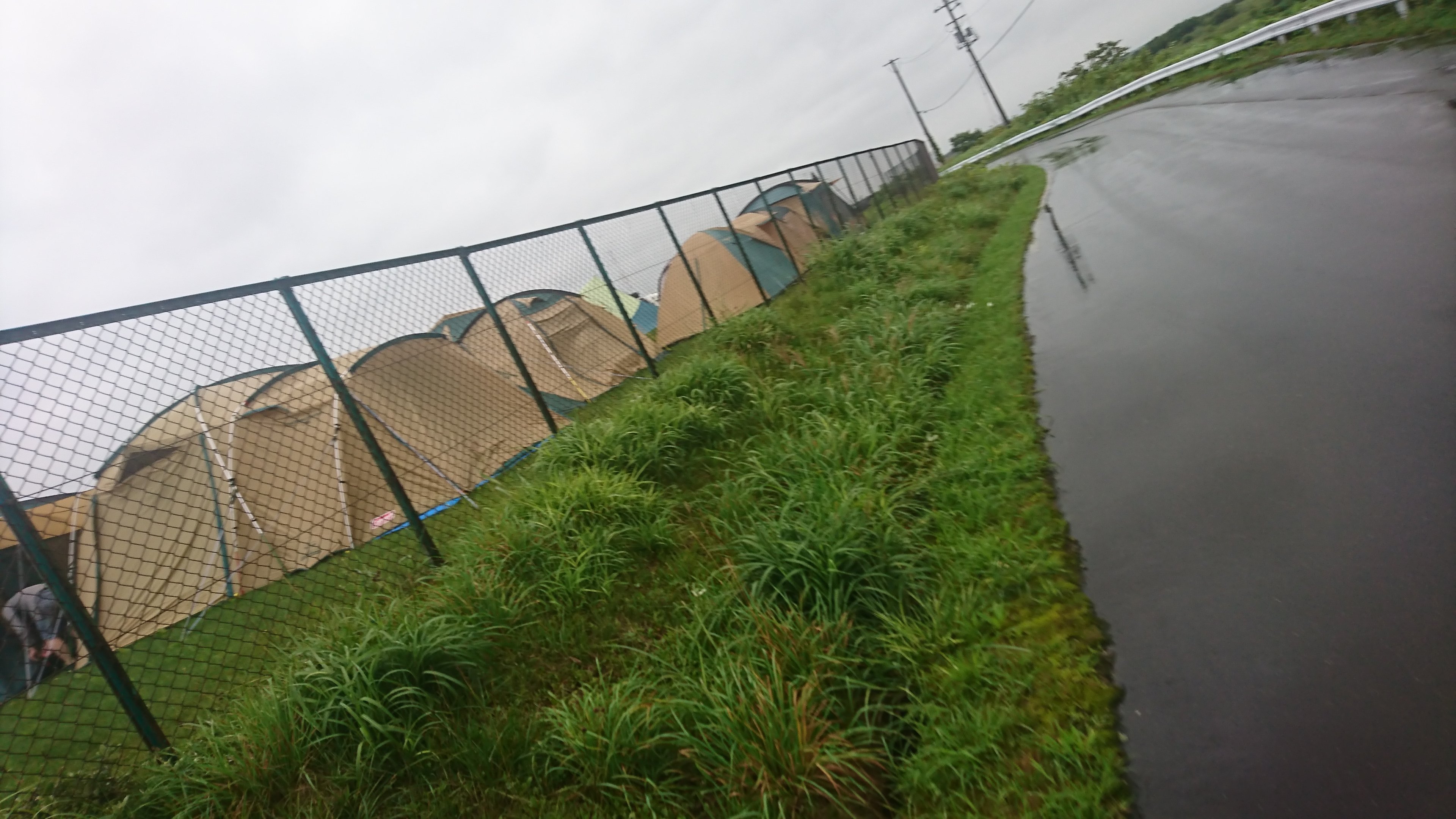 受付を終えて、雨のキャンプなのでまた色んな所から染みてくるのかなぁと思って嫌気が差していましたが、管理人さんにここにテントを張りなさい!っと言われ、管理棟の屋根下に張れました。