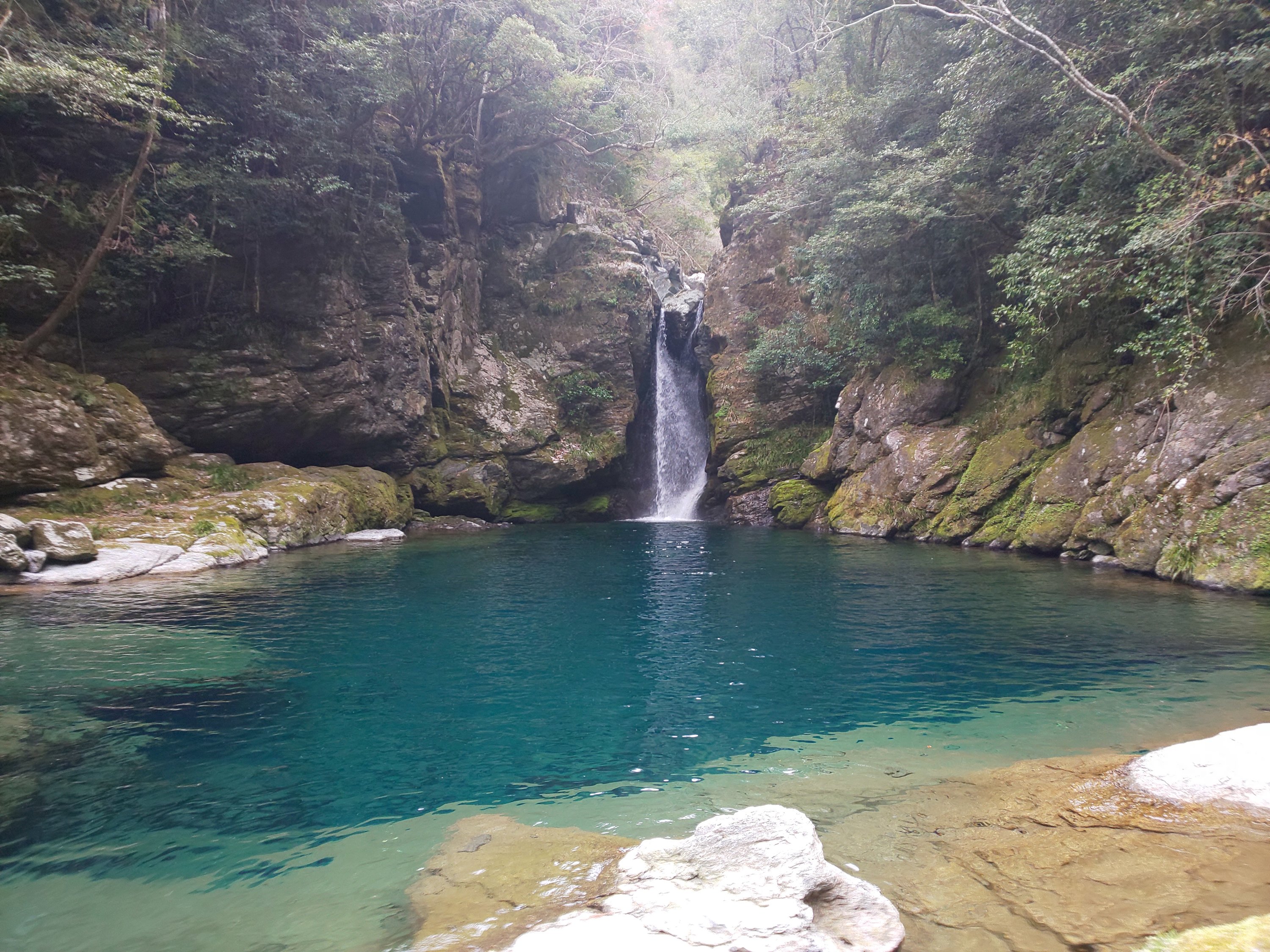 透き通る水で深さを増すと蒼くなっていた。しばらく、にこ淵を眺めていたら一緒ににこ淵到着したライダーのおじさんが話しかけてくれた。『ほんとここ綺麗ですね-。』と言ったら晴れている時はもっと綺麗だと教えてくれた。