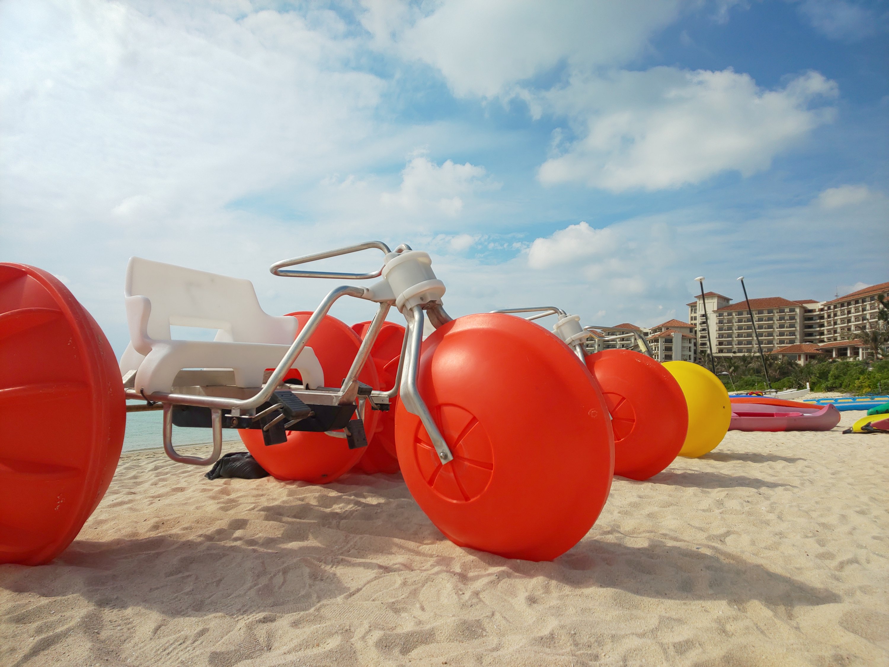 自転車で走っていると、とにかくビーチが多い!GWが終わったオフシーズンなのであまり人はいないがそれでも数人は遊んでいる。こんな物もあるので夏が似合う人達は是非、『ブセナ海中公園』に行ってみて欲しい。ブセナ海中公園は海中展望塔(海中の様子がみれる塔)、グラスボード(海底がみれる船)もオススメである。