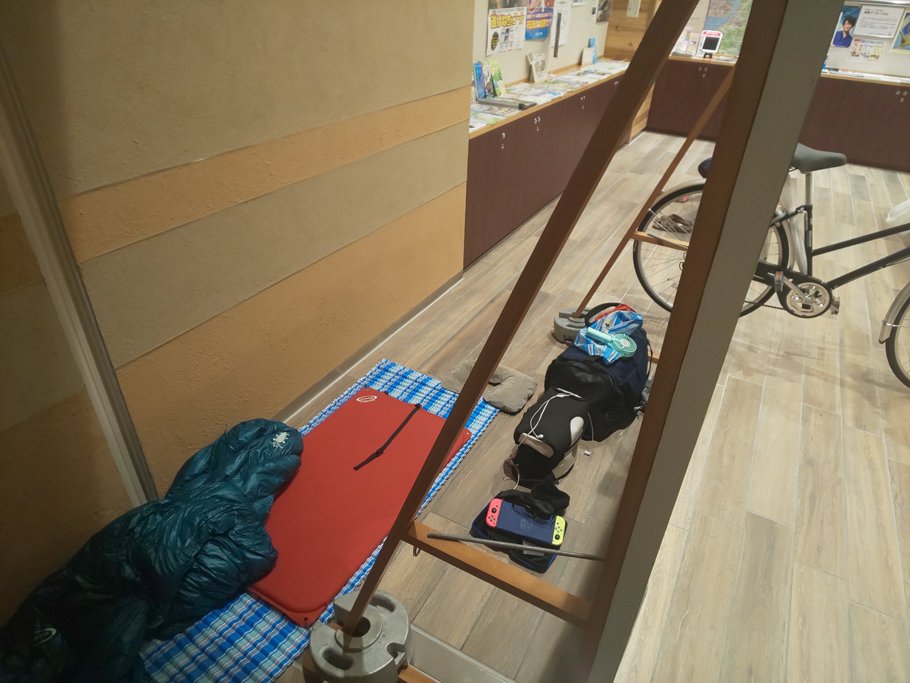 なので、左奥の看板の後ろに陣取り、こそこそと眠るのであった。(見つかるとだいぶ恥ずかしいです。)