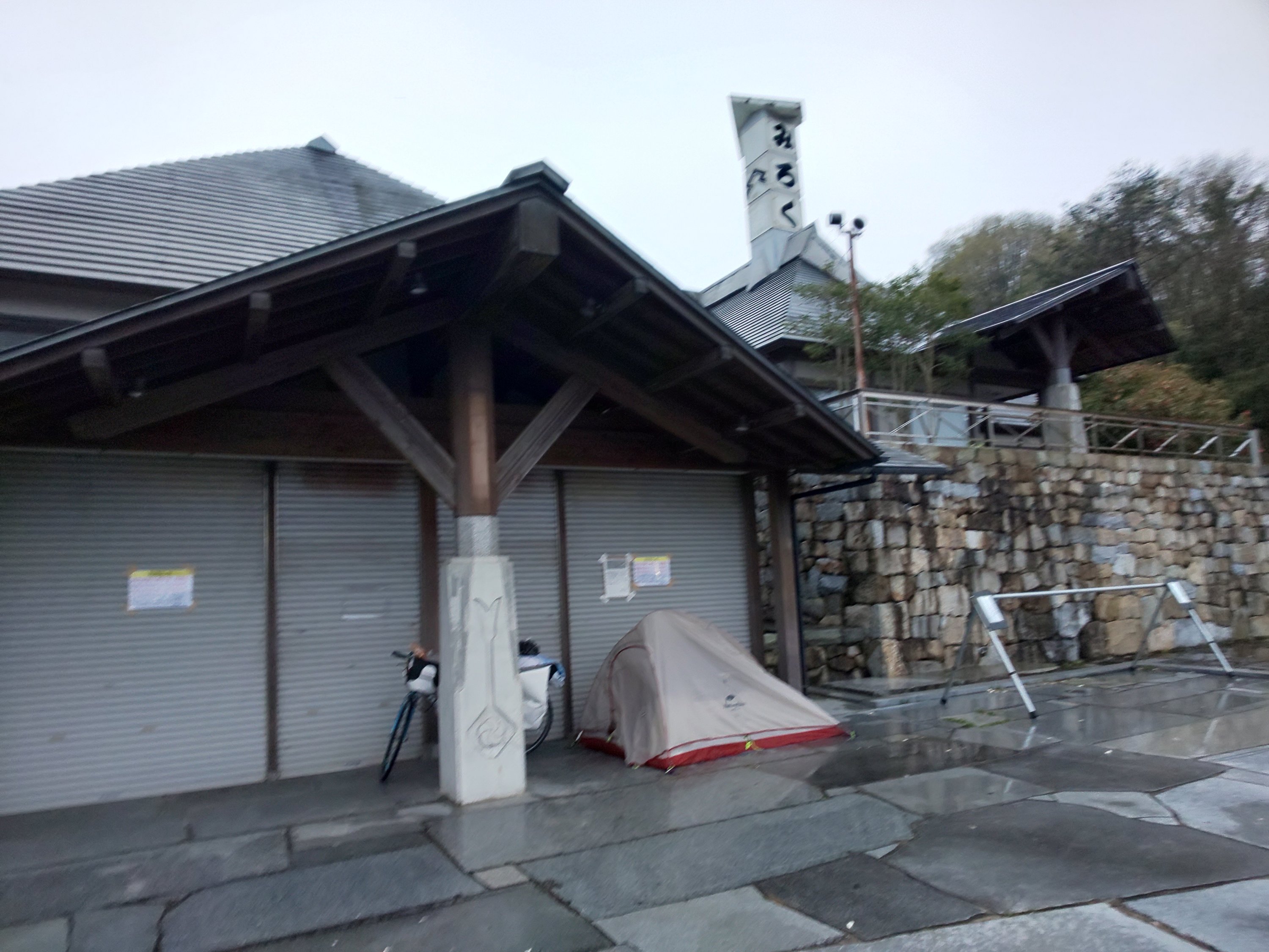 宿泊先を探しながら走っていると改装工事中の道の駅『みろく』を発見した。営業していないので、明るい時間からテントを張って一日を終えた。