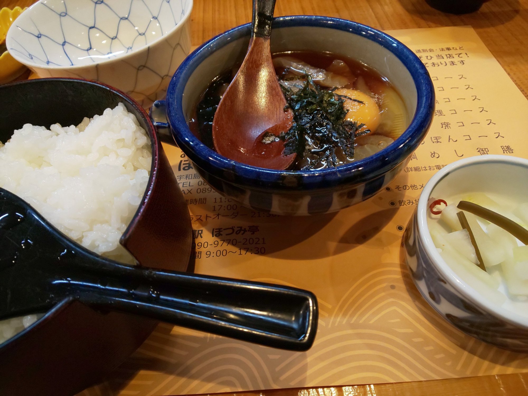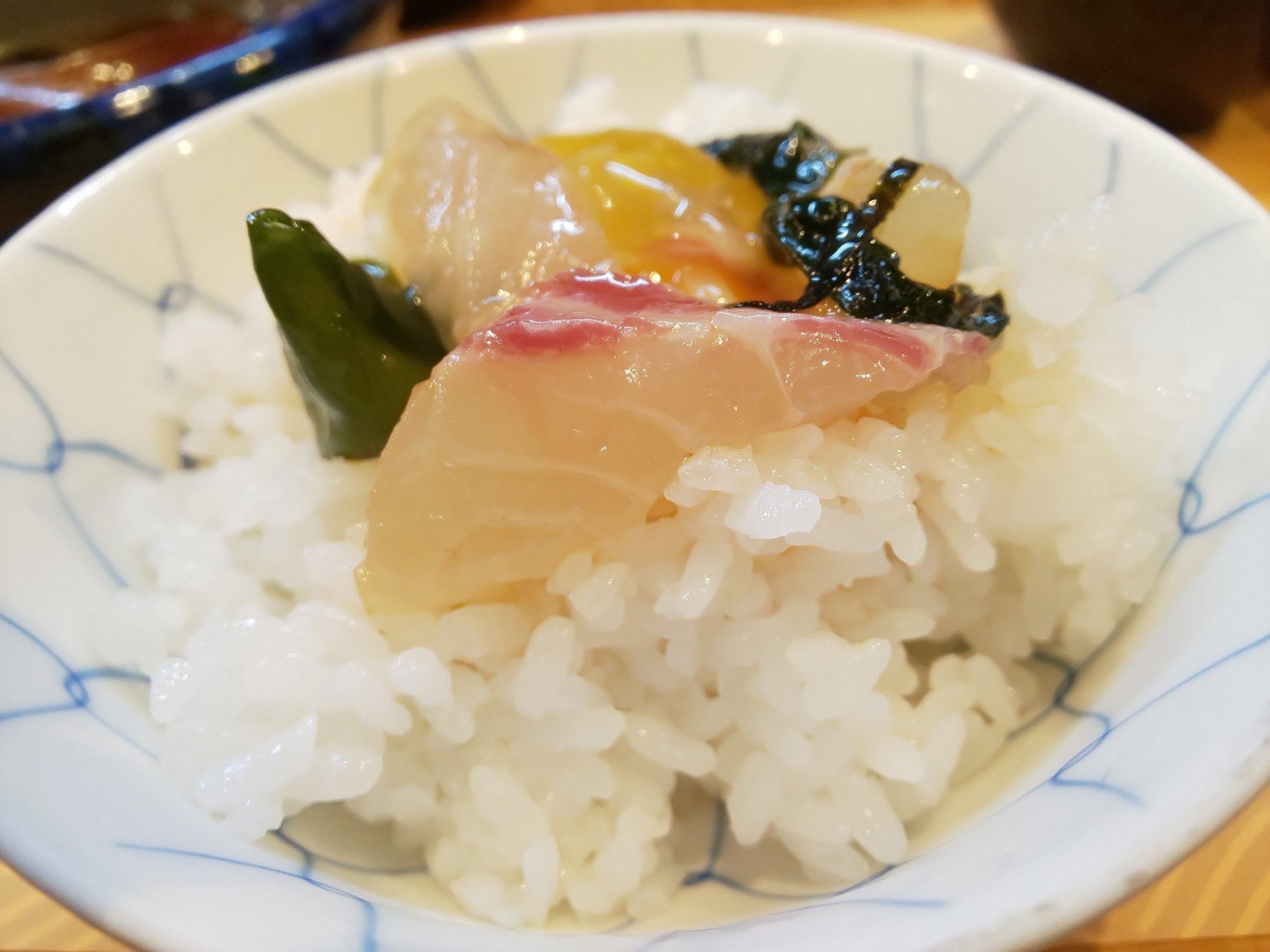 甘い出汁と鯛の刺身と卵と刻み海苔が混ざったスープ?をご飯にかけて食べます。