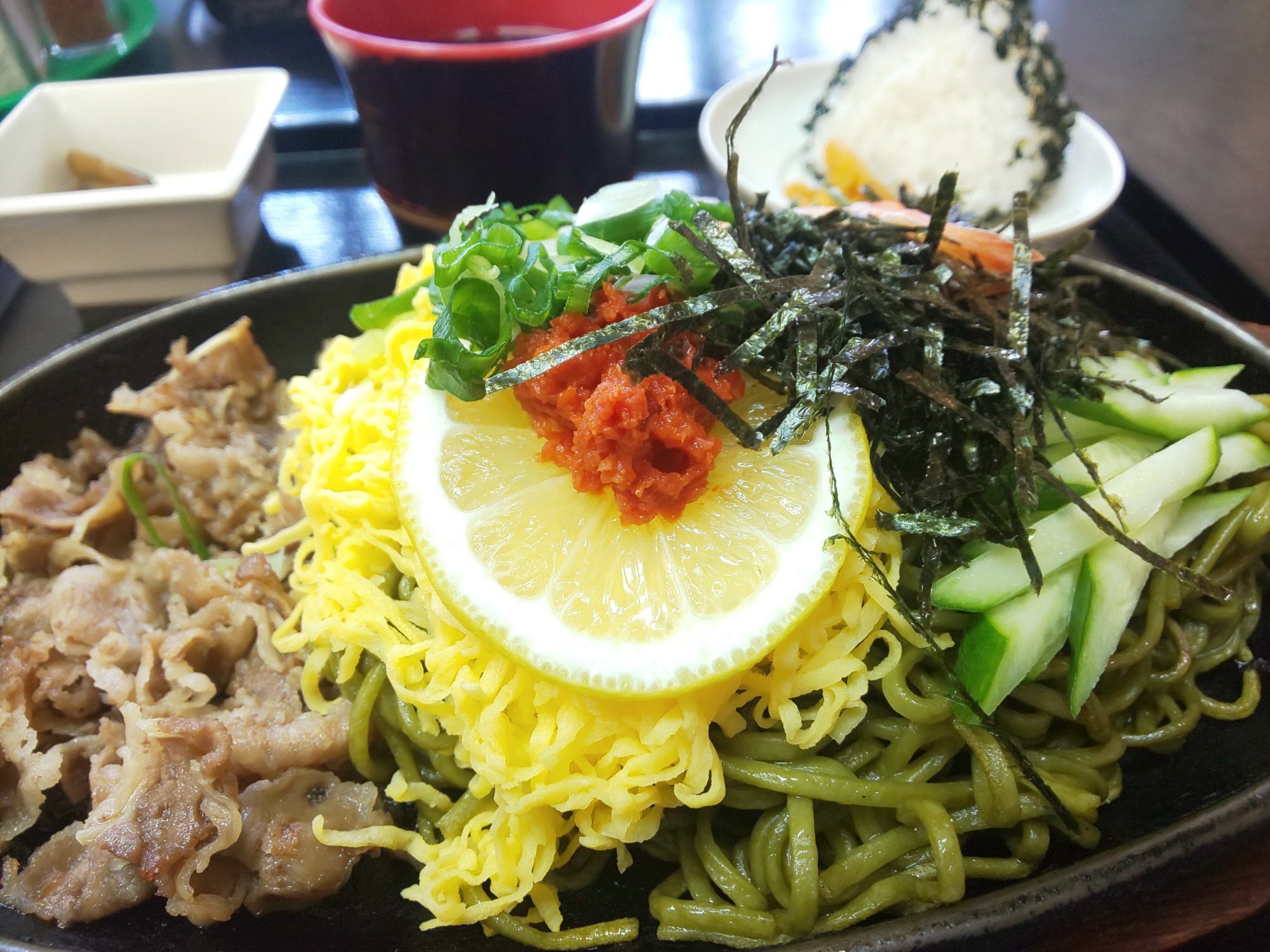 焼けた鉄板に茶蕎麦が乗っているご当地山口ご当地グルメ。