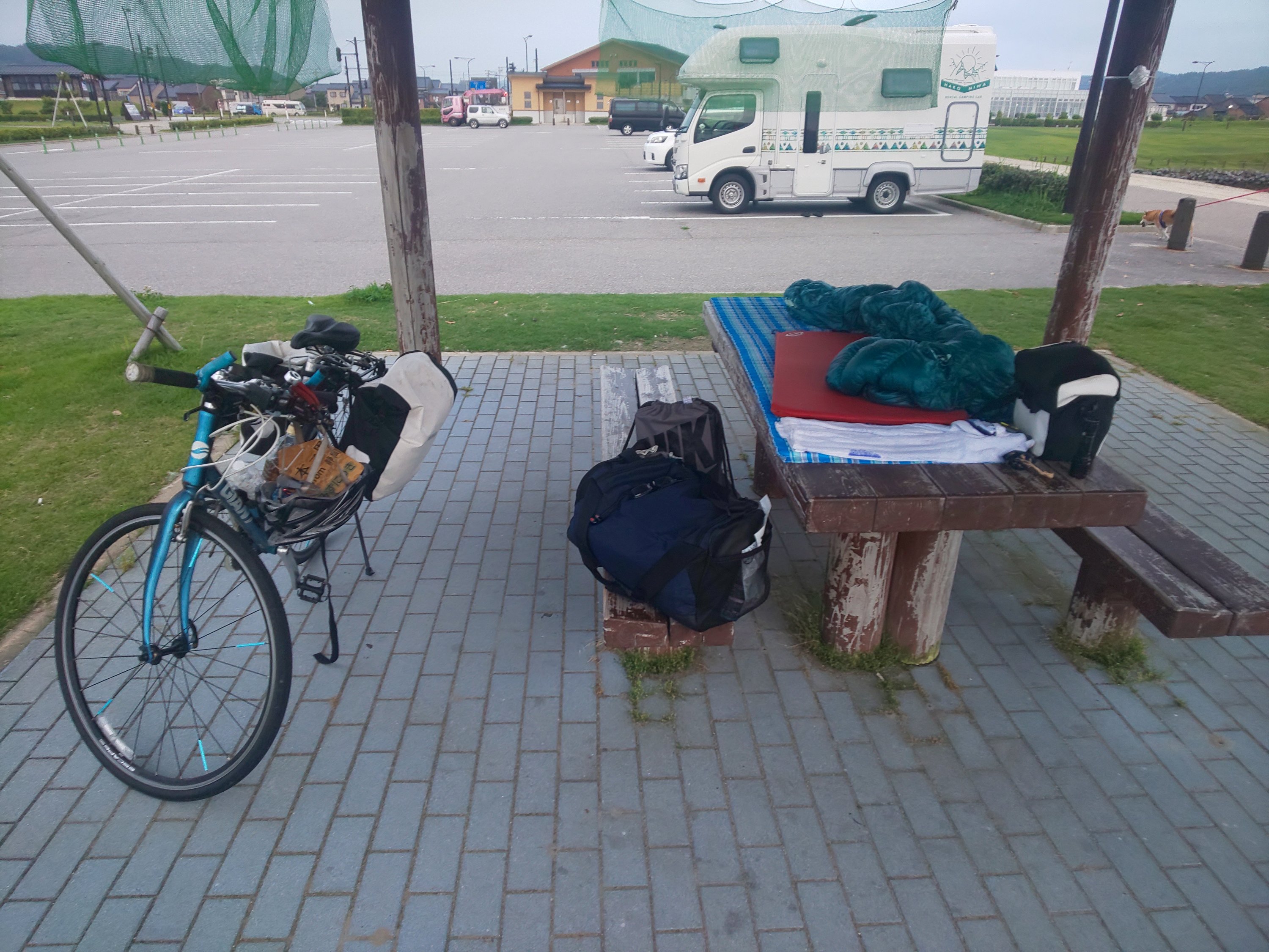 公園にて起床。散歩をいつもこの公園でしているというおじさんと話をしながら身支度をしていた。